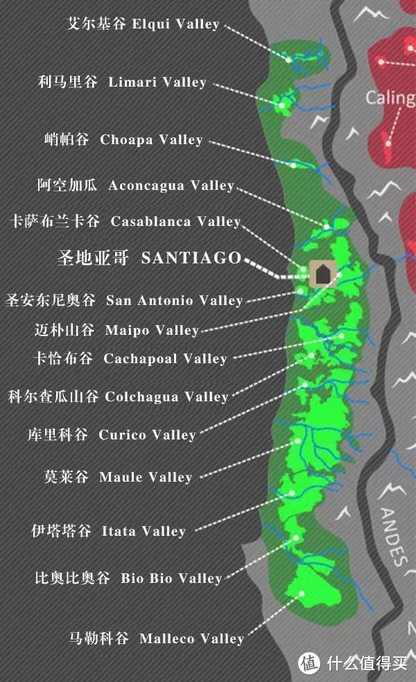 如何快速找到产区的位置呢?一般来讲,绝大多数智利酒产区都会跟在 Valley(山谷)这个词前面,所以我们可以根据 Valley 来判断一款酒产自哪里了。