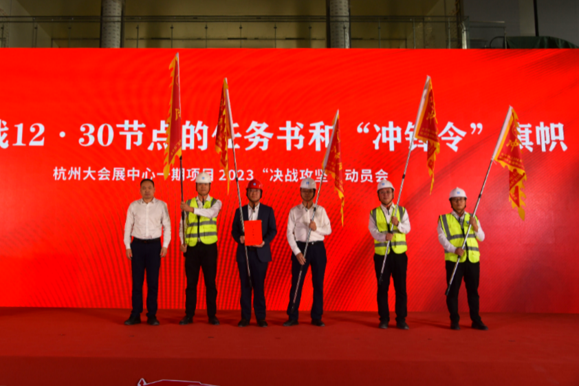 施工总承包单位为项目下达决战12·30节点任务书和“冲锋令”旗帜,勉励杭州大会展中心项目管理团队千方百计、排除万难把冲锋的旗帜插到胜利的高地。