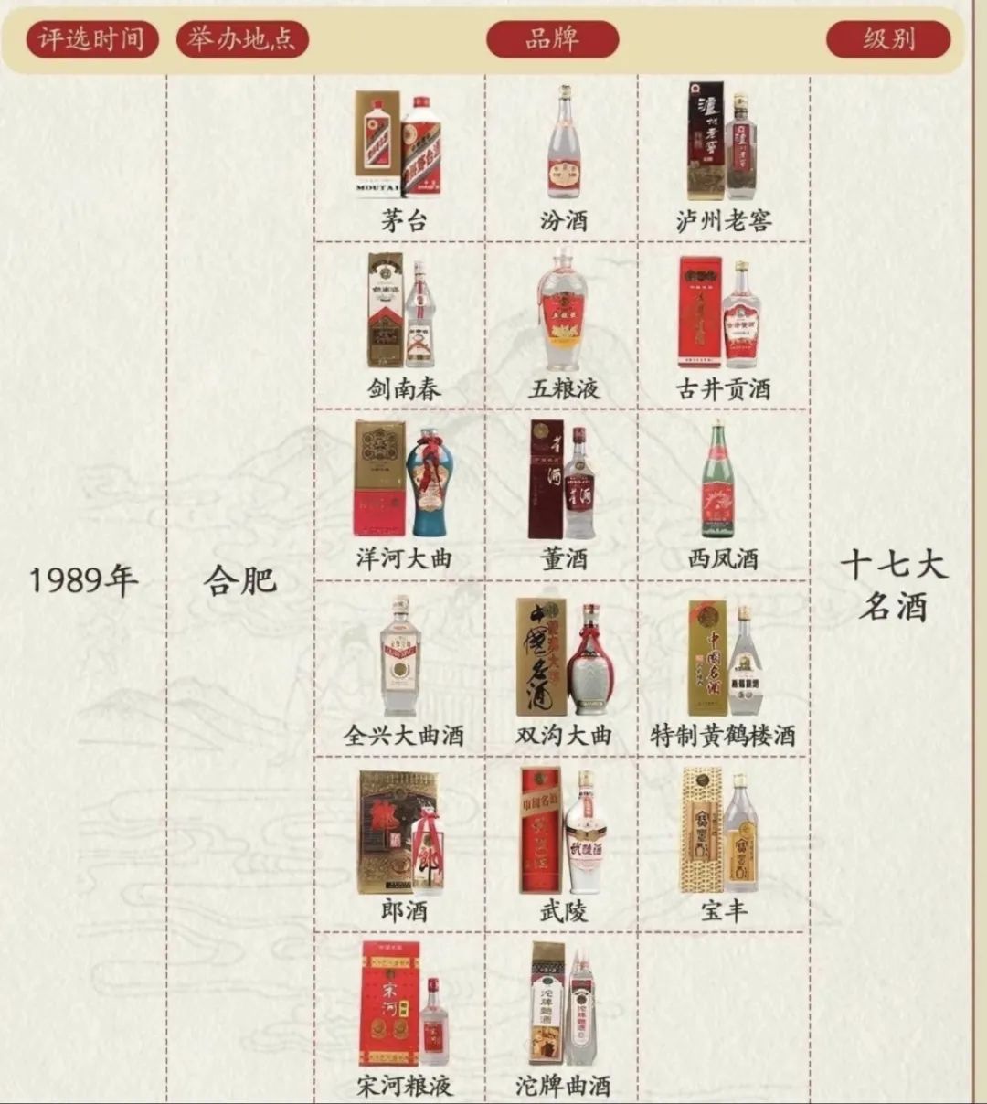 茅台、汾酒、五粮液、洋河大曲、剑南春、古井贡酒、董酒、西凤酒、泸州老窖特曲、全兴大曲、双沟大曲、特制黄鹤楼、郎酒、武陵酒、宝丰酒、宋河粮液、沱牌曲酒。