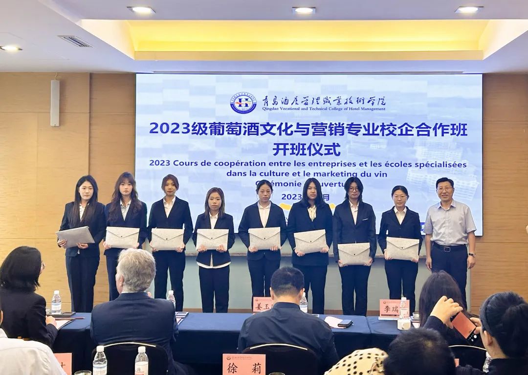 葡萄酒文化与营销专业人才培养主要聚焦于侍酒师这一新兴热门就业岗位。随着专业学习的推进,同学们的岗位认同度和技能认可度大幅攀升。开班仪式现场,合作单位--天津乐奇未来教育科技有限公司为同学们带来了贴心的学习工具包,里面有侍酒围裙、领带、酒刀、品酒笔记等,Patrick Portier校长、张校长等领导为学生发放了工作包。