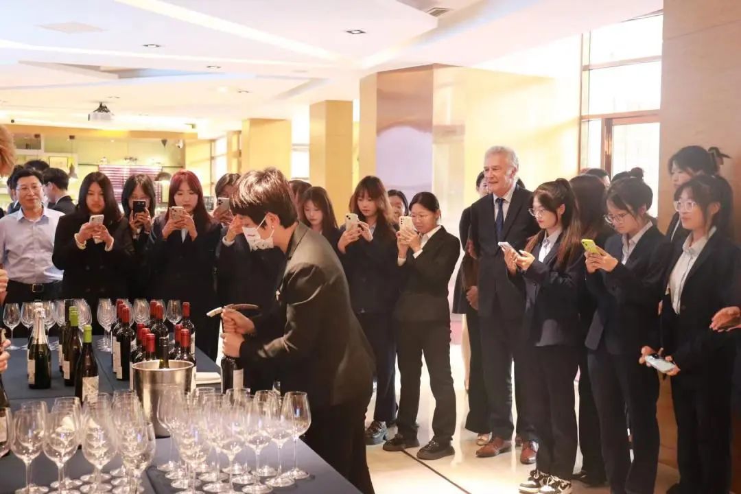 随后,全体嘉宾出席了由2023级葡萄酒文化与营销专业学生策划的开班酒会。在马刀开香槟环节,随着瓶塞的飞出,香槟如泉涌,同学们从好奇而又期待的眼神逐渐转变为对未来职业的期待,欢呼与掌声此起彼伏。