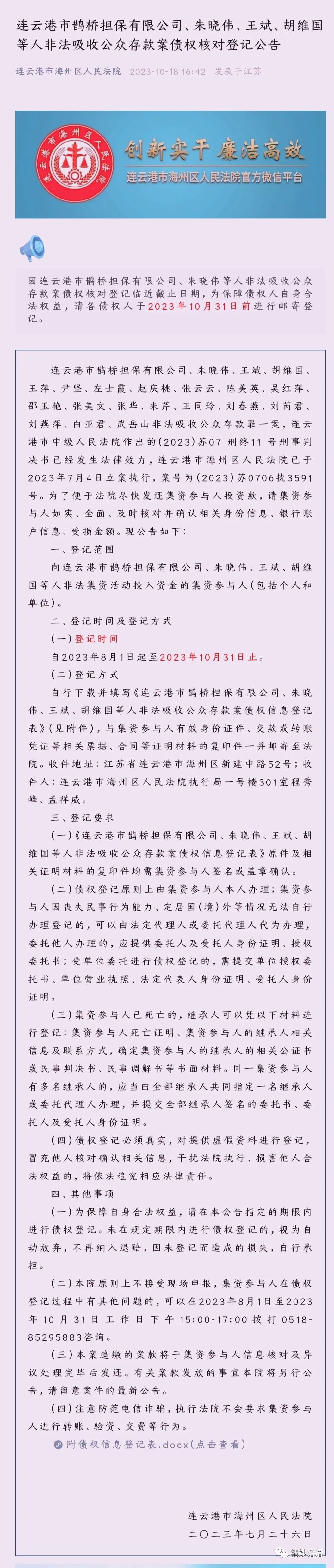 因连云港市鹊桥担保有限公司、朱晓伟等人非法吸收公众存款案债权核对登记临近截止日期,为保障债权人自身合法权益,请各债权人于2023年10月31日前进行邮寄登记。