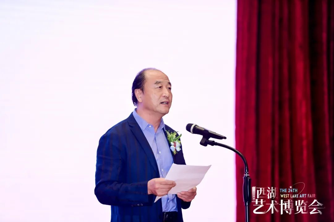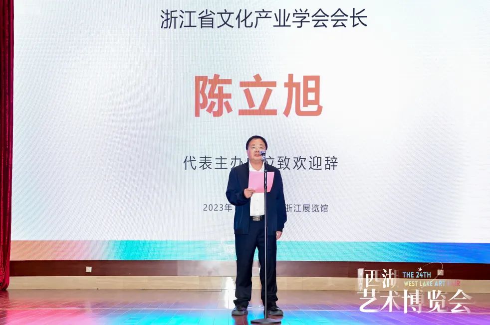 浙江省文化产业学会会长陈立旭先生代表主办单位致欢迎辞,他谈到:“西湖艺术博览会作为杭州市的一张金名片,已经走过了许多年的历程,积淀了丰富的历史与荣誉。这一艺术盛会吸引了众多艺术机构和组织的积极参与,也一直秉承着传承和宣扬时代艺术的使命。展会不仅呈现各种形式的艺术作品,还将深刻理解党的文化思想,并将其贯彻在我们的艺术活动中。并且,丰富大家的艺术精神生活,让更多人感受到艺术的力量和魅力,是我们的使命,也是我们的责任。我们将不断努力,不断创新,为艺术事业的繁荣和党的文化事业的发展贡献我们的力量”。