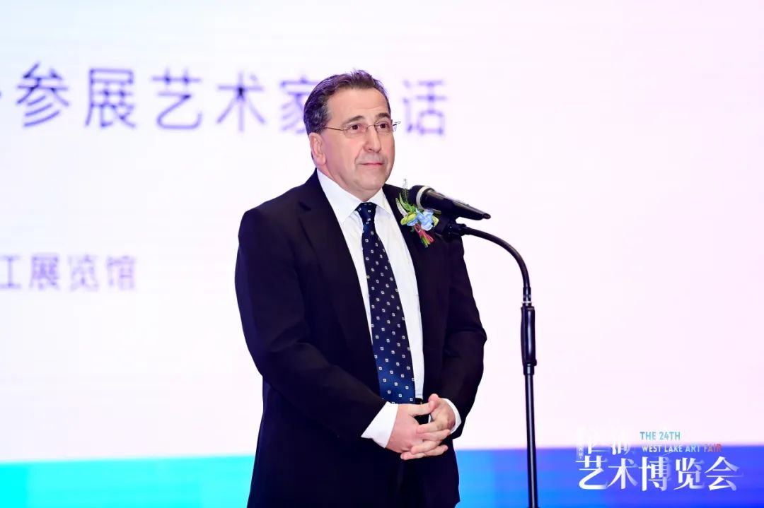 西湖艺术博览会特邀艺术家、中国美术学院教授周刚先生代表国内参展艺术家发表讲话,他回顾了去年西湖艺术博览会的情景,强调了团队的坚守与热爱,并对艺博会的未来表达了期望。他提到,去年的西湖艺术博览会在特殊的背景下举办,这样的坚持是西湖艺术博览会团队的特质,团队一直以踏实做好事业为己任。周刚先生还强调了西湖艺术博览会作为一个舞台的重要性,这个舞台汇聚了众多艺术家,提供了他们相互交流和博弈的机会。艺术家的作品也因此走进了大家的生活,将艺术融入日常。他期待着今年的博览会同样能够圆满成功,延续着这种宝贵的交流和艺术品味的传播。
