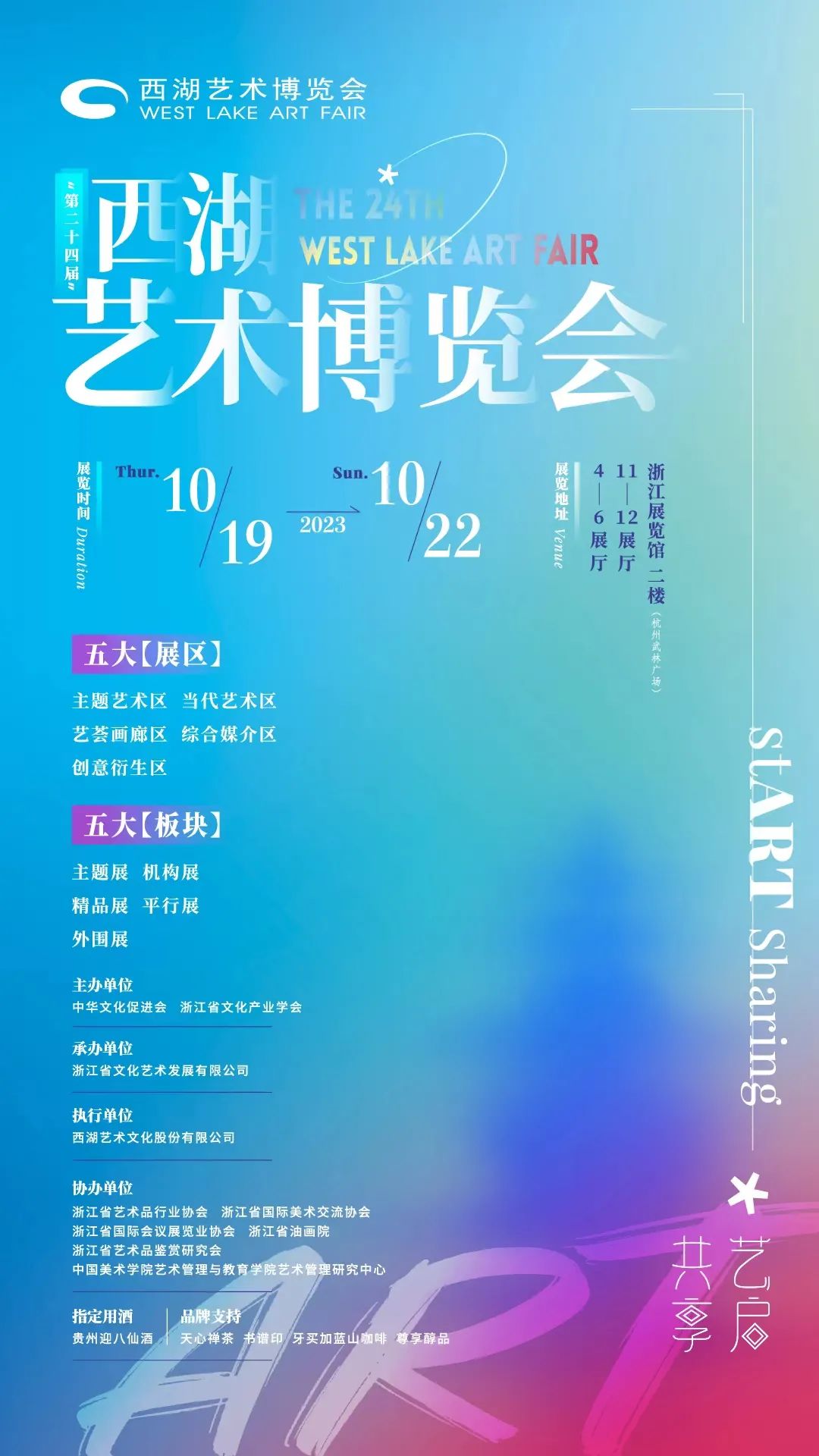 第二十四届西湖艺术博览会于10月18日晚上7:00在浙江展览馆盛大开幕,本届艺博会的主题是“艺启共享 stART sharing”,这一主题强调了艺术的启发作用和共享的价值,旨在通过艺术展览和系列活动,传递创意和文化的信息,充分展现新时代的文化之美、艺术之美、和谐之美、生活之美、百姓之美,将生活回归艺术,以深刻的战略眼光和全局视野,为新时代文化高地的建设注入新的活力。此次西湖艺术博览会由中华文化促进会、浙江省文化产业学会主办,浙江省文化艺术发展有限公司承办。