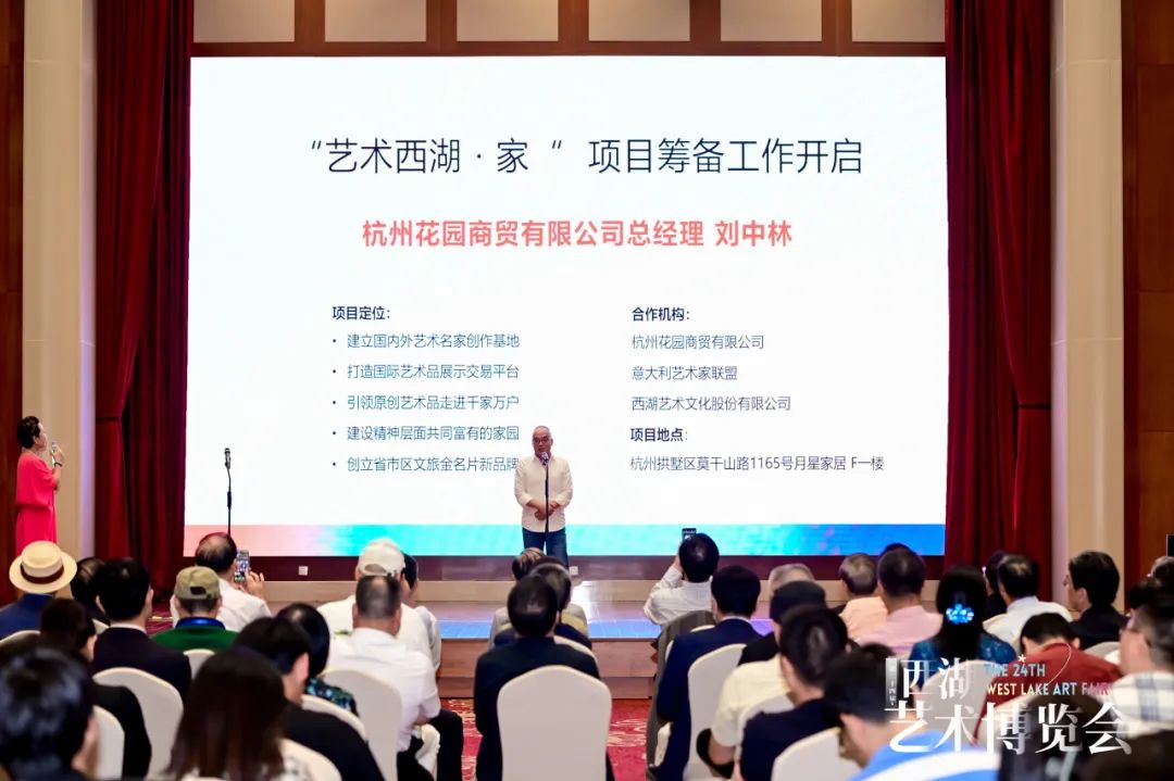 接下来,开幕式特别举行了"艺术西湖·家"项目筹备工作的启动仪式,仪式中,杭州花园商贸有限公司总经理刘中林称"艺术西湖·家"项目的主要目标之一是建立国内外艺术名家创作基地,为艺术家提供一个有利于创作的环境。这一举措将有助于吸引更多杰出的艺术家来到杭州,为当地的文化和艺术场景带来新的活力。他强调,这不仅仅是为艺术家们提供一个工作场所,更是鼓励跨文化的艺术交流和合作,争取把打造国际艺术品交易平台。这一平台将为艺术品的交易提供更多便捷的方式,从而吸引投资者和收藏家。这不仅将提升杭州作为艺术品交易中心的地位,也将为艺术家提供更多的商业机会,推动他们的作品进入国际市场。这一愿景的实现,将为艺术家、投资者和观众创造更多的机会。