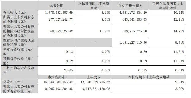 其中,2023年第三季度实现营业收入17.78亿元,同比增长5.94%;实现净利润2.77亿元,同比增长8.03%。