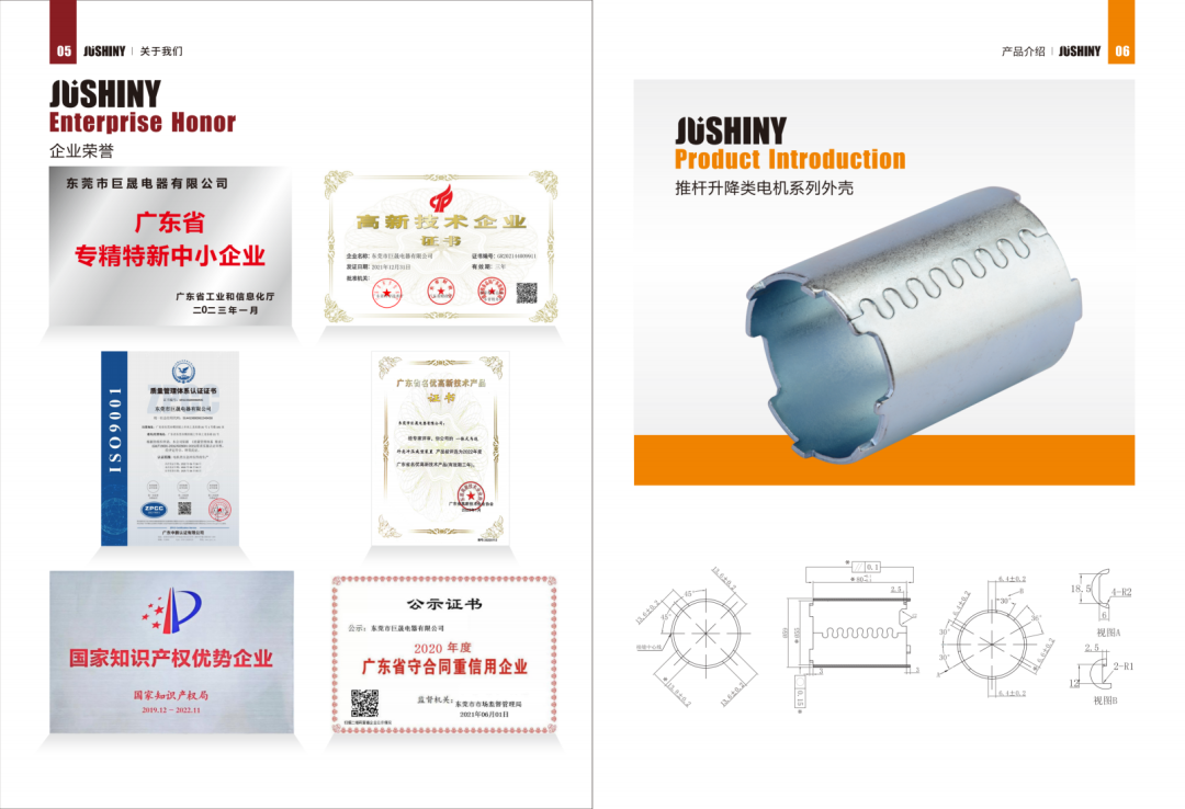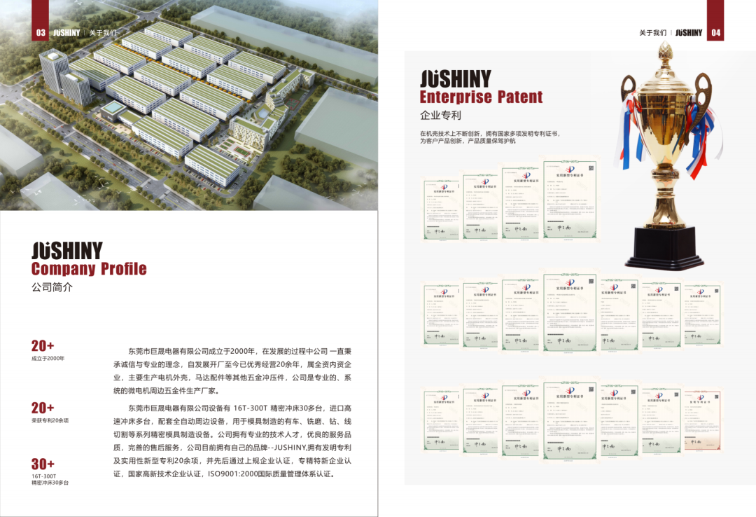 东莞市巨晟电器有限公司成立于2000年,在发展的过程中公司一直秉承诚信与专业的理念,自开厂至今已成功经营20余年,属全资内资企业,主要生产电机外壳,马达配件等其他五金冲压件,公司是专业的、系统的微电机周边五金件生产厂家。东莞市巨晟电器有限公司设备有16T-300T精密冲床30多台,进口高速冲床多台,配套全自动周边设备,用于模具制造的有车、铣磨、钻、线切割等系列精密模具制造设备。公司拥有专业的技术人才,优良的服务品质,完善的售后服务,公司目前拥有自己的品牌--JUSHINY,拥有发明专利及实用性新型专利20余项,并先后通过上规企业认证,专精特新企业认证,国家高新技术企业认证,ISO9001:2000国际质量管理体系认证。