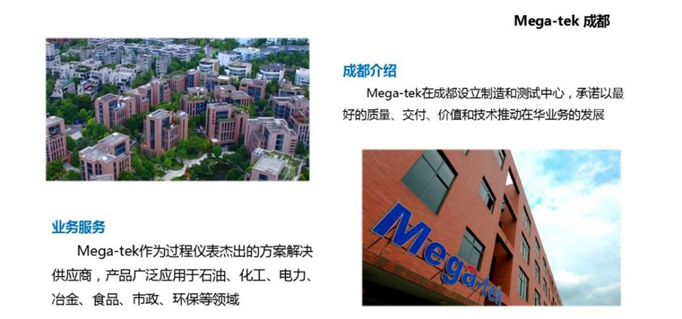 作为亚太地区业务运营中心的成都 Mega-tek 面向于亚洲区域业务拓展,专业致力于工业仪表的制造及解决方案的研发,具有丰富的疑难工况解决经验。先进的技术,专业的团队,为广大用户过程控制保驾护航。