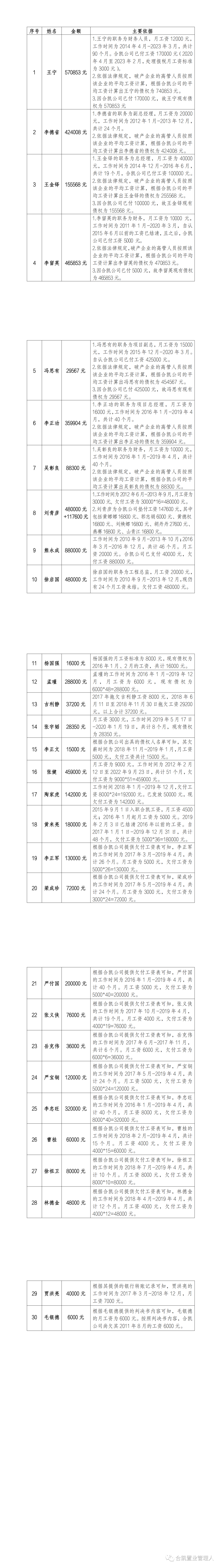 管理人高度重视职工债权的调查、审核工作。管理人通过各种渠道通知职工,并接收债权申报。同时,管理人通过实地调查、访谈记录、社保查询等方法,且根据职工提供的工作记录、证人证言及工资发放等证据,进行充分审查后对部分职工债权作出了初步认定。2023年9月18日,管理人在“合凯置业管理人”公众号上进行了第一次公示,希望得到各方的帮助和监督,准确认定职工债权。职工债权公示后,管理人陆续收到一些监督意见和书面异议。对此,管理人高度重视。因职工债权的准确认定,是破产程序中的重要工作,职工债权是否真实也关乎到每位债权人及集资参与人的切身利益,故管理人根据各方意见和线索,对职工债权进行了慎重复查。但受合凯公司未向管理人移交详细的财务账册等因素影响,对于部分职工的工作时间、工资标准等仅依靠管理人的力量,客观上无法进行准确调查。本着对全体债权人、集资参与人负责的态度,管理人再次向各位征集职工债权的线索及证据,请大家对公示的人员是否属于合凯公司的职工、公示人员的工资标准及欠薪期间是否准确等方面进行监督,如有相关线索或证据,请于本公告发布后15日内将书面材料提交给管理人(口头异议无效),以便尽快查明职工债权的真实情况。欢迎各位通过电子邮件、微信或者书面邮寄等方式,对职工债权进行监督,管理人后续也会将审查后的职工债权情况及时进行公示。2、管理人联系方式:书面邮寄地址,郑州市金水区金成时代广场9号楼606,赵律师,15617748978(微信同号)。电子邮箱,15713888395@163.com。