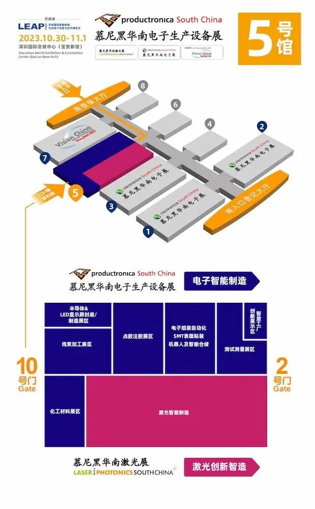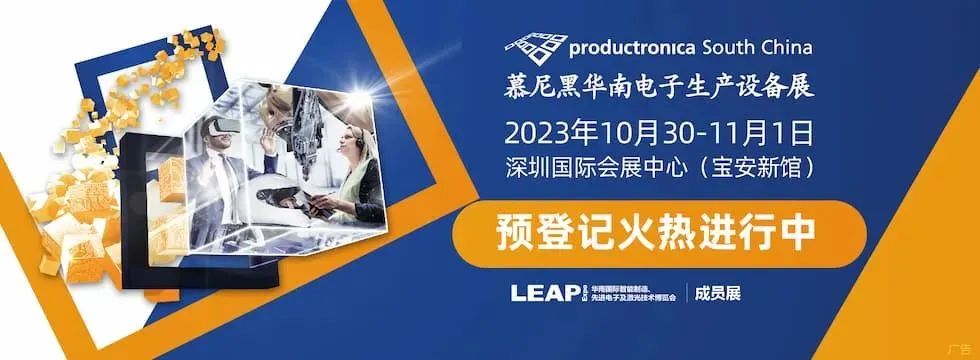 2023年华南国际智能制造、先进电子及激光技术博览会(简称LEAP Expo)旗下成员展慕尼黑华南电子生产设备展将于10月30-11月1日,再次登陆深圳国际会展中心(宝安新馆)。展会将围绕自动化与运动控制、测试测量、表面贴装、点胶注胶&化工材料、线束加工、半导体封装及制造、智慧工厂等领域,立足行业前沿,聚焦新旧动能转换,为电子智能制造行业提供一个横跨产业上下游的专业交流圈。