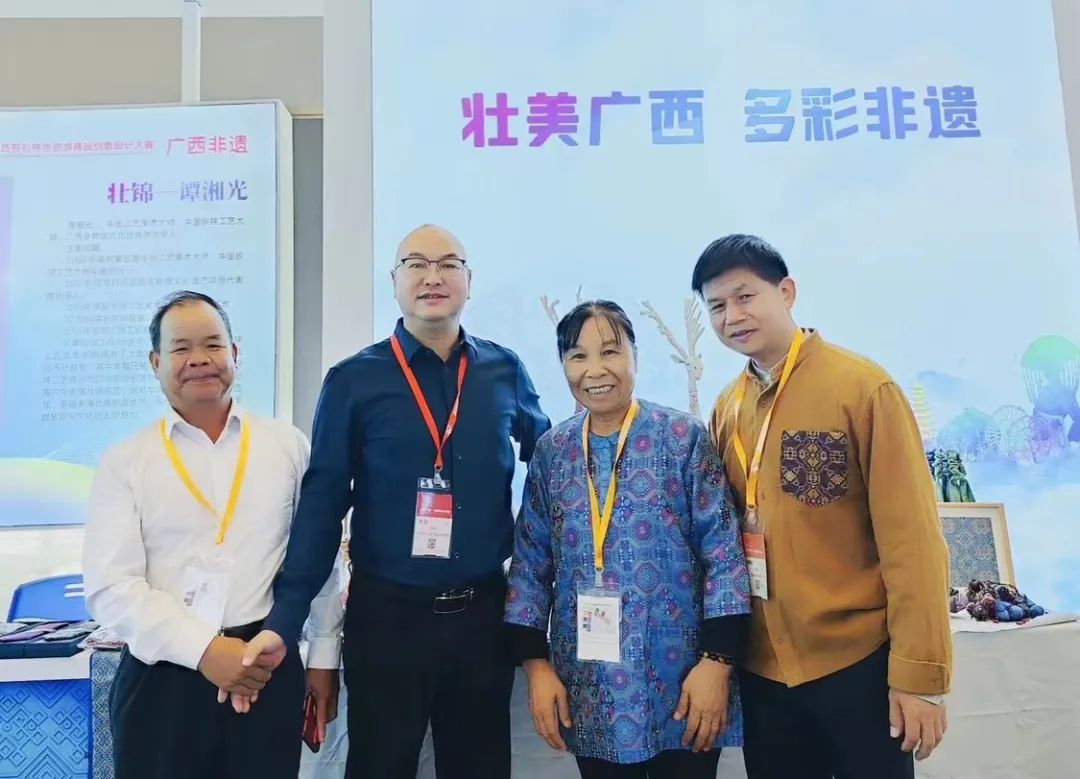 “中国织锦工艺大师”、“中国工艺美术大师”谭湘光创办了宾阳县湘光织锦坊,并获得了“广西传统工艺工作站”、“中国工艺美术大师非遗传承基地”等称号。近年来,在她的带领下,宾阳织锦技艺注重传统与时尚的结合,设计出了壮锦服饰,真皮包包、娇憨可爱的小牛公仔、精致小巧的耳环,装购物袋的兔公仔等系列壮锦系列产品,深受年轻人的喜爱。