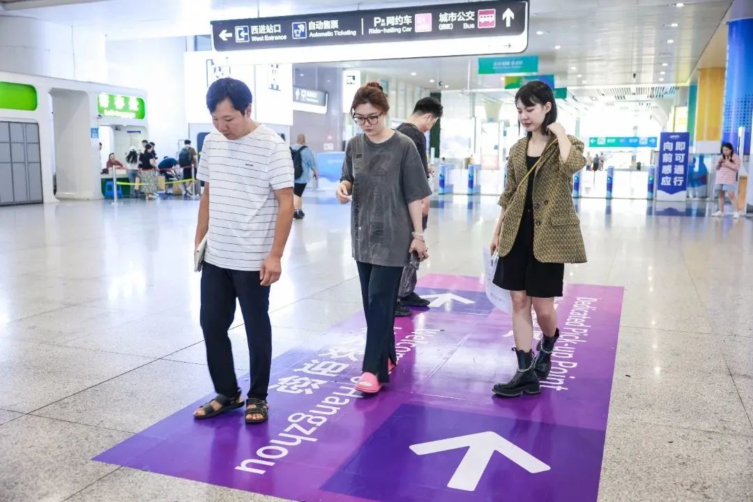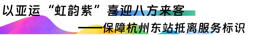 亚运会期间,杭州东站枢纽以“虹韵紫”喜迎八方来客,利用视觉标识清晰引导、高效分流,为东站空间增加语言能力,在客流高峰确保抵离顺畅。