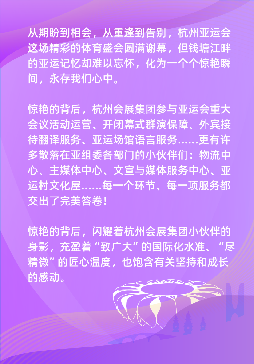 杭州亚运会的多场高级别会议活动均由杭州会展集团提供全方位、高品质的运营服务,得到了来自亚组委外联部、竞赛部、赛事总指挥部外事礼宾指挥中心的认可和感谢。