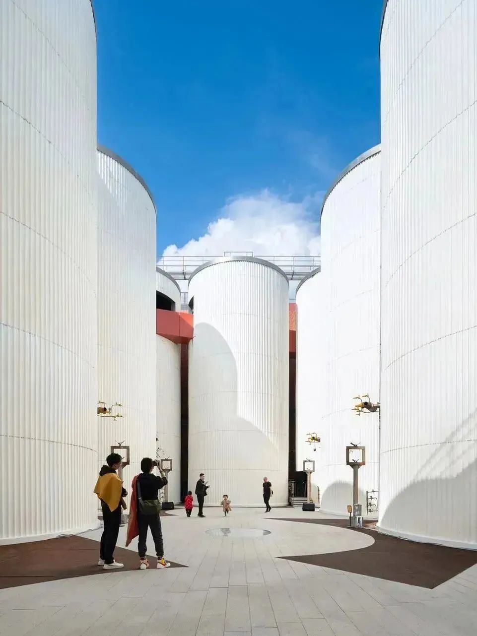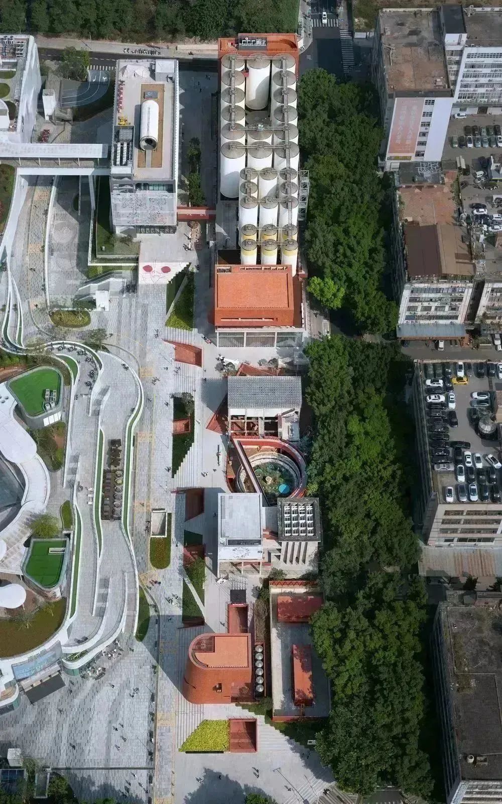 作为项目整体改造团队,URBANUS都市实践建筑设计团队采用整合、插接、介入性的改造策略,统合原本散落的工业遗存建筑单体体量,将零散的厂房遗构在场地中串联成完整的空间序列。在保留现状混凝土建筑、原啤酒厂发酵罐罐体等基础上,进行节点性空间介入,创造灵活可变的活动场地。