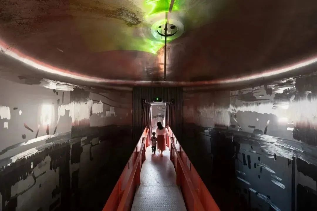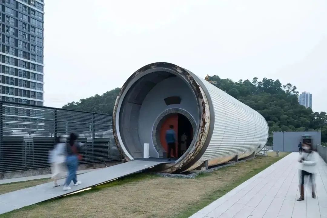 所以深双在建筑师、建筑空间和城市居民之间搭建了接口。我们在改造过程中保留的留白,为接口提供了被可供入的空间。在深双策划与落地的过程中,我们和策展人有过非常多的讨论,很多展览内容的呈现形式是因空间而产生的。在E栋顶楼横卧的筒仓里,深规院的朱荣远老师带队做了一个像望远镜一样的装置,人们进入这个横放的筒仓空间中,被展示宇宙和星空的多媒体影像包裹其中。望远镜一头望着山,一头望着楼。深圳是一个多丘陵的城市,但是在城市化的进程中推平了很多山包,这里留着城市里所剩无几的山丘。