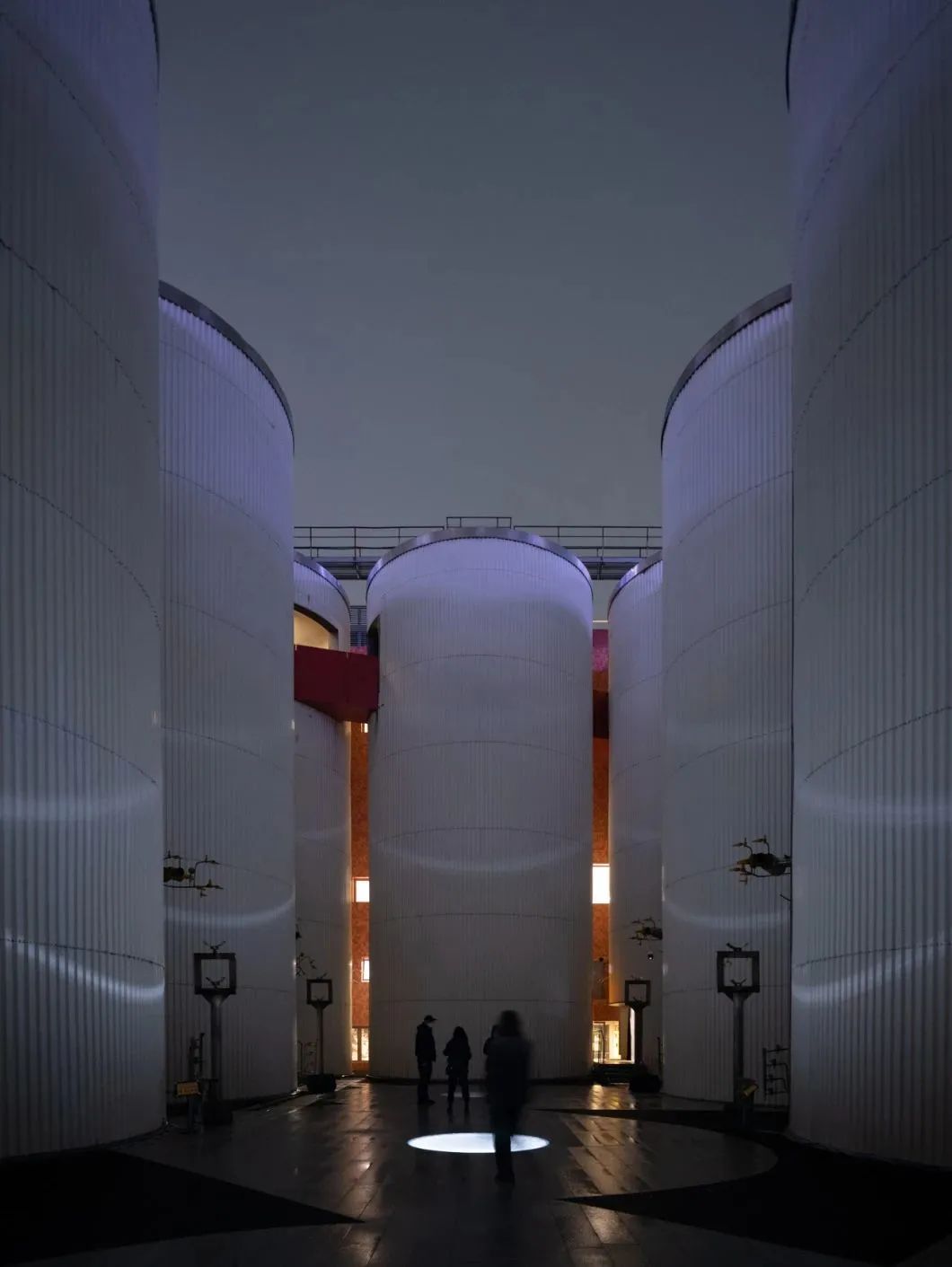 原本人是无法进筒仓的,只能从最底端的孔洞看到上面的不锈钢罐体。我们花了很大的工夫将罐体切开,置入了桥和楼梯,人在其中穿行的体验是非常奇异的。拔掉了几个筒仓,其中一个尺寸比较小的我们没舍得扔掉,后来在结构检测安全的情况下放在了对面楼的屋顶上,成为空间装置。