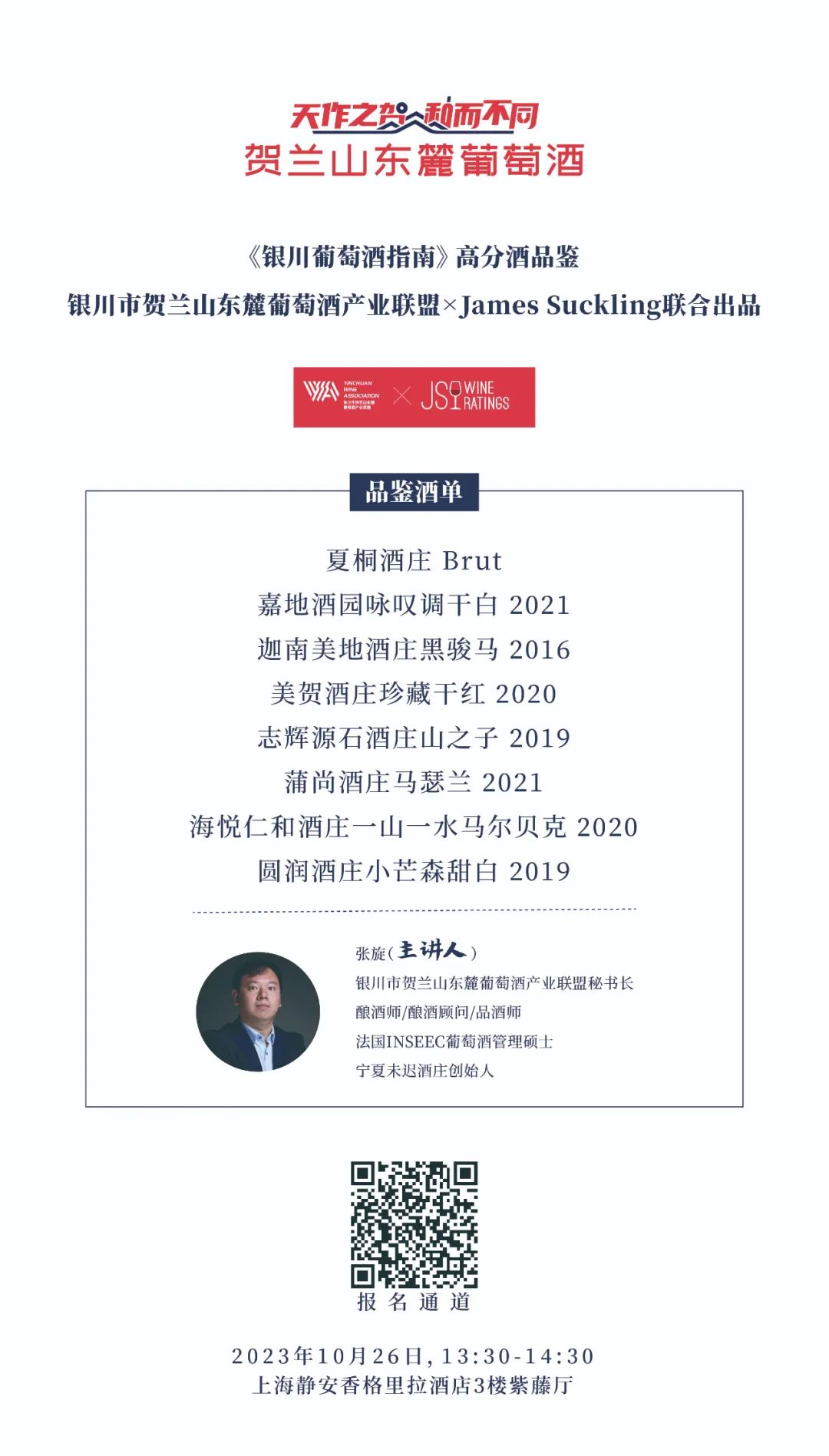 蓄势待发,荣耀而至!贺兰山东麓葡萄酒银川产区2023城市巡展火热开启,美酒狂潮,即将席卷华东三城——上海、南京、杭州。上海站还将举行《银川葡萄酒指南》高分酒品鉴——银川市贺兰山东麓葡萄酒产业联盟 × James Suckling联合出品主题大师班,专属至臻品鉴,见证中国精品葡萄酒崛起的良机。