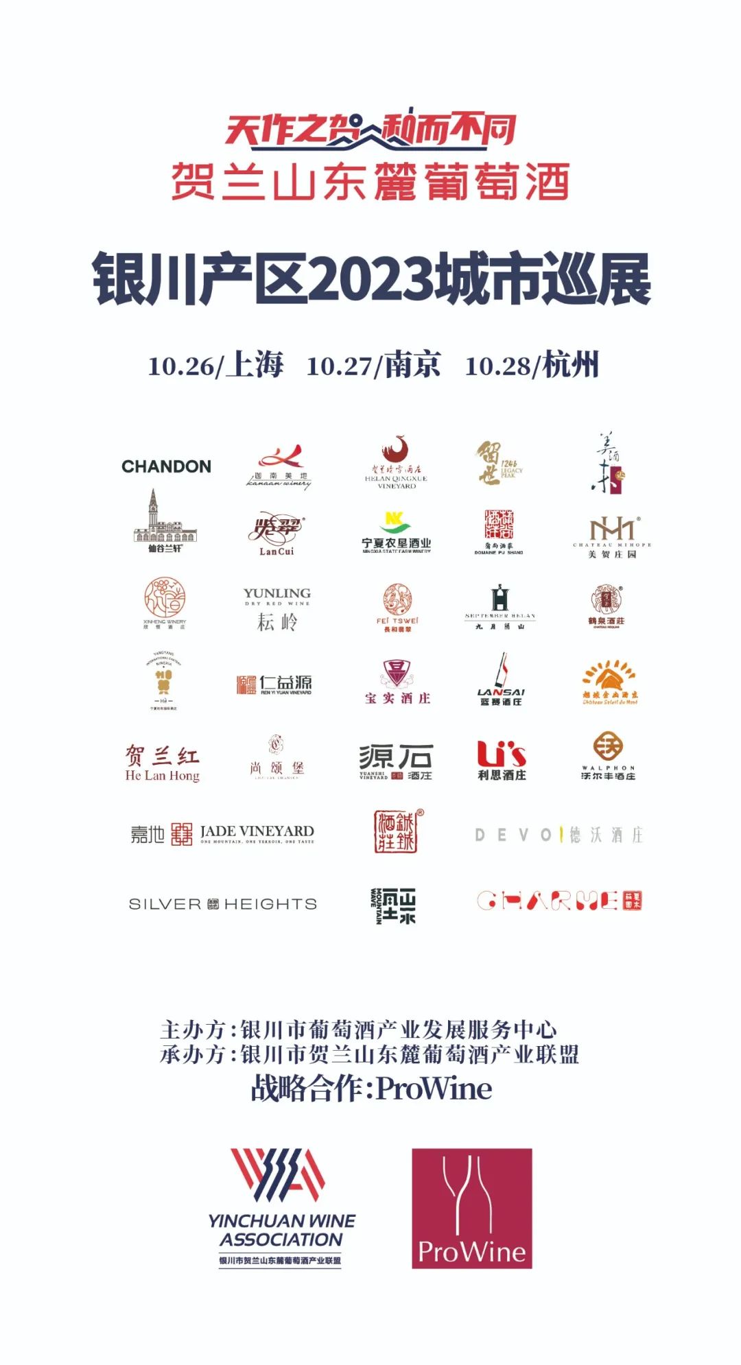 银川市葡萄酒产业发展服务中心联合银川市贺兰山东麓葡萄酒产业联盟携手ProWine,演绎城市巡展精彩——贺兰山东麓葡萄酒银川产区2023城市巡展将于10月26日登陆华东三城——10月26日上海,10月27日南京,10月28日杭州。