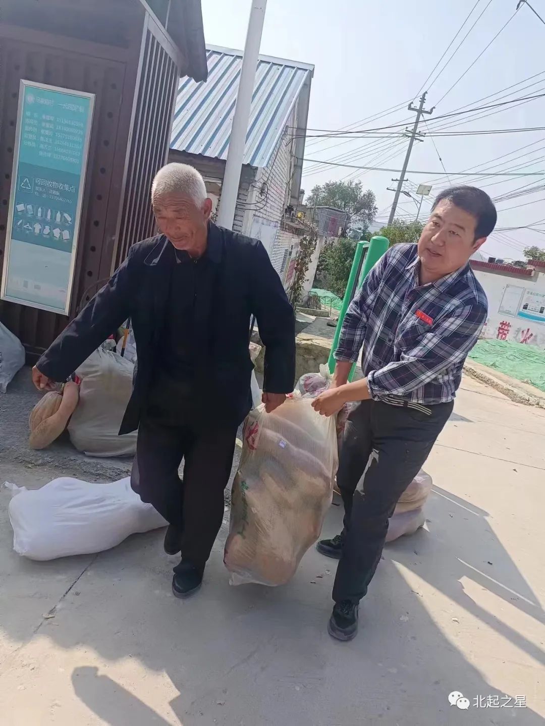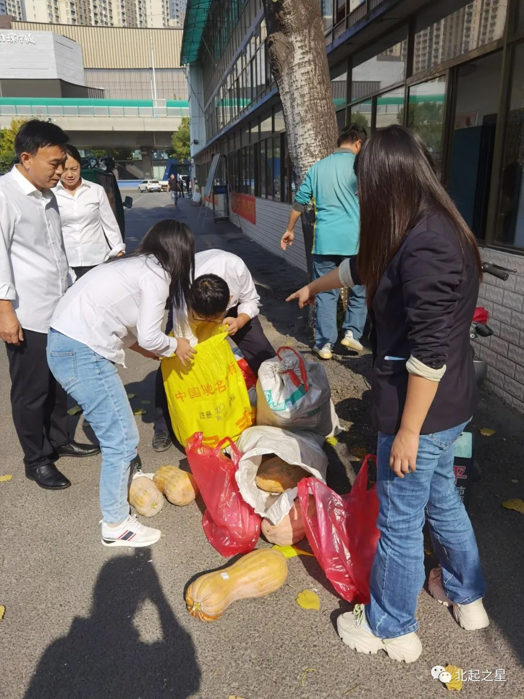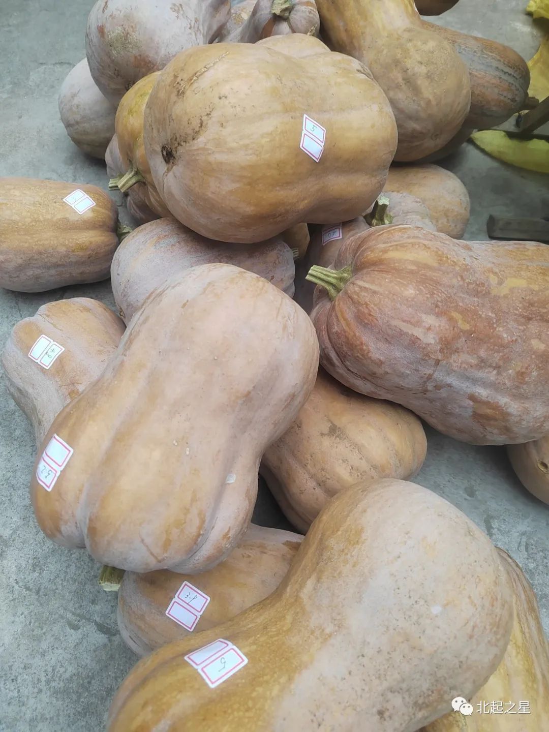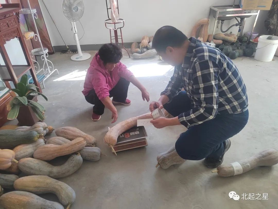 为解决村区老年人出行不便的问题,“第一书记”刘侃挨家挨户上门为老乡收南瓜,再用三轮车统一拉到村委,为方便公交职工挑选,刘侃还将每一个南瓜现场过称,并张贴上重量标签。