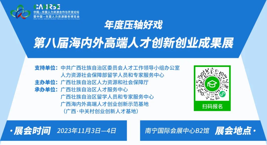 作为2023年中国—东盟人力资源合作与开发论坛暨中国—东盟人力资源服务博览会(简称“人博会”)的重要活动之一,第八届海内外高端人才创新创业成果展(简称“海创展”)将于11月3日至4日在南宁国际会展中心B馆二层举办,规划设置海内外高端人才项目成果展区、中国—东盟人才项目成果合作交流展区、人才小高地项目成果展区、乡村振兴人才成果展区、博士洽谈区等,其中海内外高端人才项目成果展区将展出百项海内外高层次人才创新创业成果,组织项目推介、项目路演、对接交流等活动,搭建广西与海内外高层次人才、技术项目交流对接平台,最大限度吸引人才来桂创新创业。