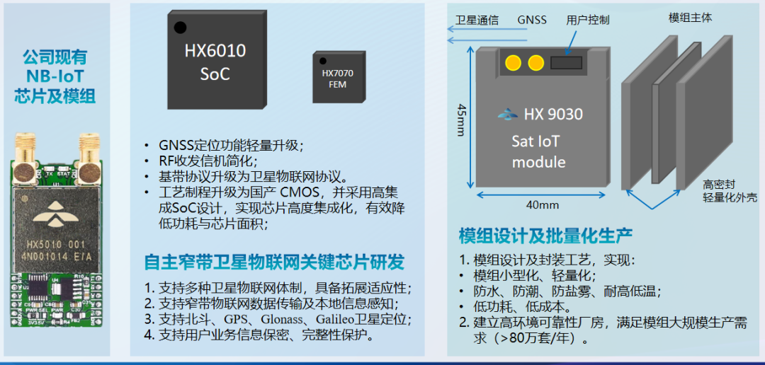 中国科学技术大学电子科学与技术系教授林福江团队长期从事微波/微电子交叉学科的研发工作并取得了一系列成果。项目基于现有的NB-IoT芯片及模组,提出窄带卫星物联网模组研发方案,基于现有芯片,升级GNSS定位系统,使其可支持北斗、GPS、Glonass、Galileo卫星定位;基带协议由NB-IoT升级为卫星物联网协议,支持多种卫星物联网体制,具备一定的拓展适应性;芯片工艺制程升级为国产 CMOS,采用高集成SoC设计,显著减少芯片数量,实现芯片高度集成化,可有效降低芯片功耗与面积。