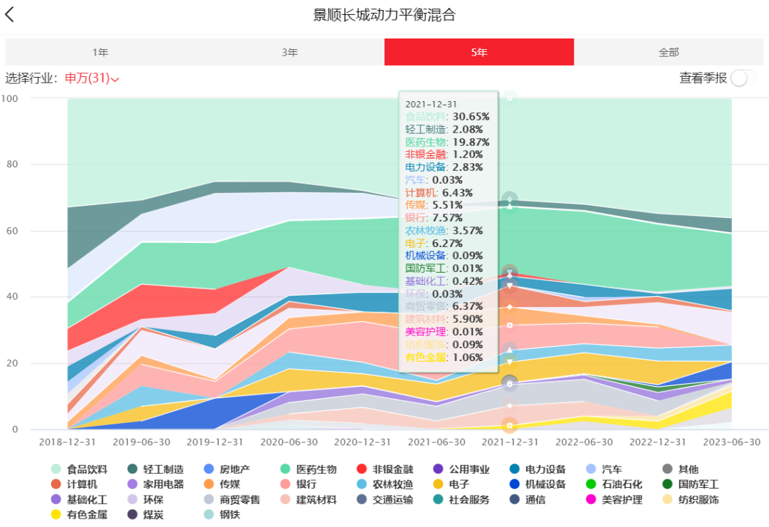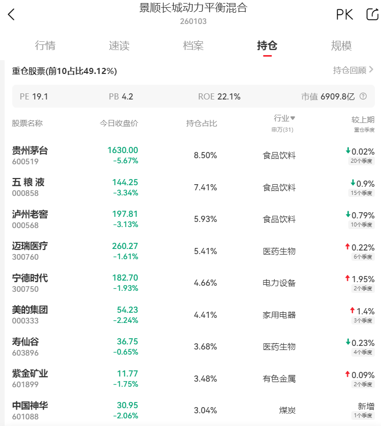 均衡偏集中,食品饮料和医药占了一半的仓位,前十只股票仓位49%。