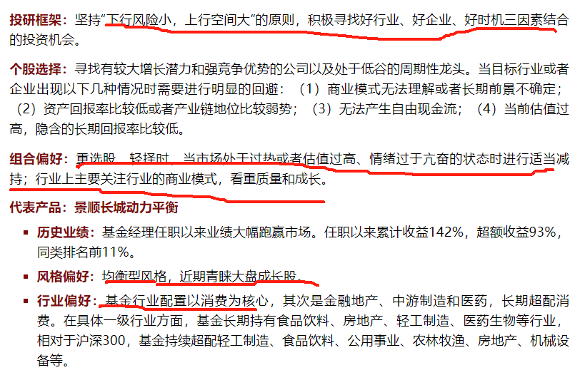 2015年9月29日任职以来,任内收益129.92%,同类前11%。【研究员经历】:2005年任职于深圳国际信托,2008年加盟鹏华基金,历任研究部高级研究员、基金经理助理、基金经理,2015年加入景顺长城【代表基金】:景顺长城动力平衡,2015年9月29日开始管理,任职回报129.92%,同类前11%【投资标签】:大盘成长,重仓白酒、医药,景顺长城动力平衡股票仓位75%,连续8年跑赢沪深300,同类前50%(1)投资方法:坚持“下行风险小、上行空间大”的原则,寻找好行业、好企业、好时机相结合的投资机会。关注行业商业模式,看中质量和成长,重选股、轻择时,市场过热或估值过高时会适当减仓。