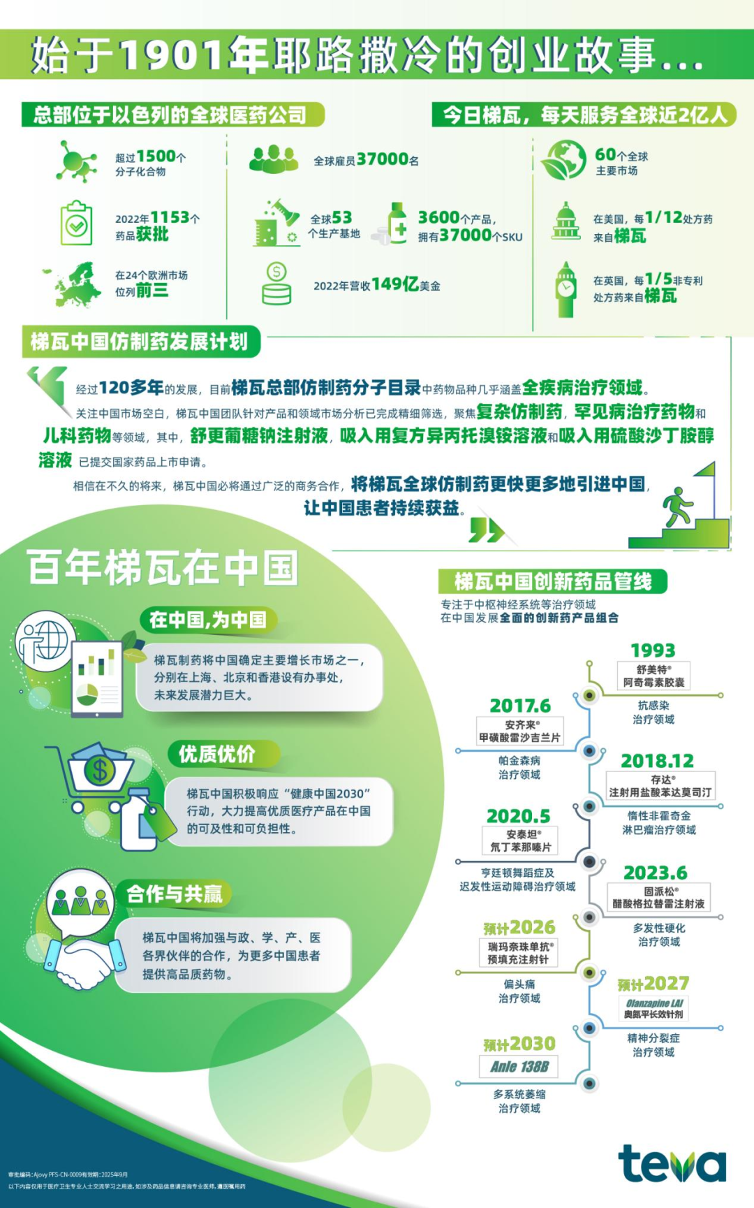 梯⽡成⽴于1901年,是⼀家以⾊列制药公司。作为全球领先的制药公司,梯⽡致⼒于研发和⽣产改善⼈类⽣命健康的产品。⽬前,公司拥有超过3600种产品,覆盖⼏乎所有治疗领域,每天服务全球近2亿⼈。
