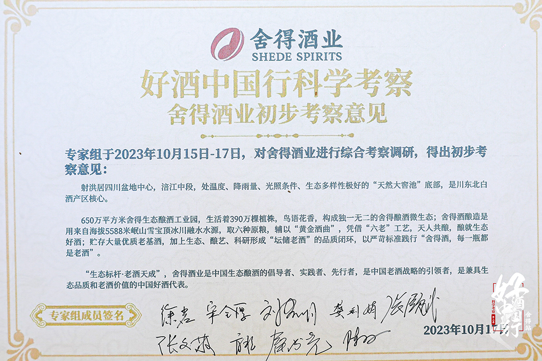 “舍得酒业是中国生态酿酒的倡导者、实践者、先行者,是中国老酒战略的引领者,是兼具生态品质和老酒价值的中国好酒代表。”专家组在舍得酒业的初步考察意见中如此表示。