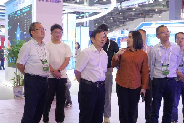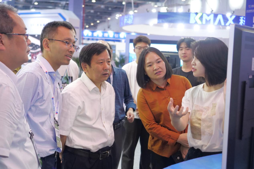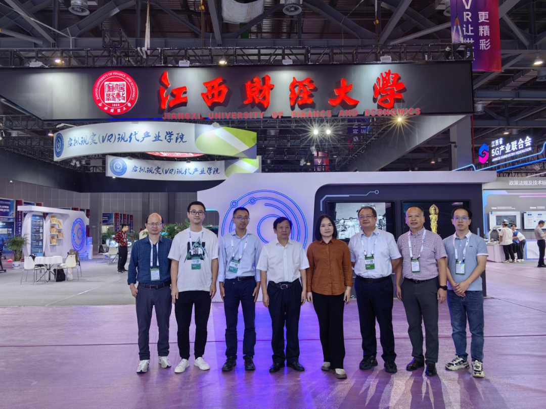 10月18日下午,在2023世界VR产业暨元宇宙博览会即将开幕之际,校党委书记卢福财到学校展区参观指导,党办、校办主任罗锐陪同。