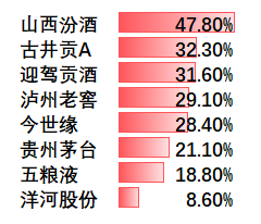 山西汾酒。独一档,达到惊人的48%,接近50%。汾酒的复兴看起来势不可挡。全国化布局快速推进,这种迅猛增长态势会持续多久