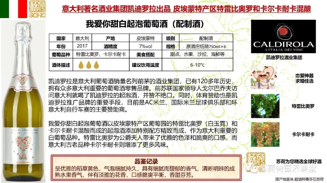 我爱你甜白起泡葡萄酒,意大利凯迪罗拉酒业集团出品,呈优雅的稻草黄色,气泡细腻持久,具有细腻而馥郁的香气,清晰明辨的成熟水果香气,伴有淡雅的花香,口感脆爽平衡,香甜芬芳。预订请拨打043184506666或咨询苏荷酒业相关选酒顾问。