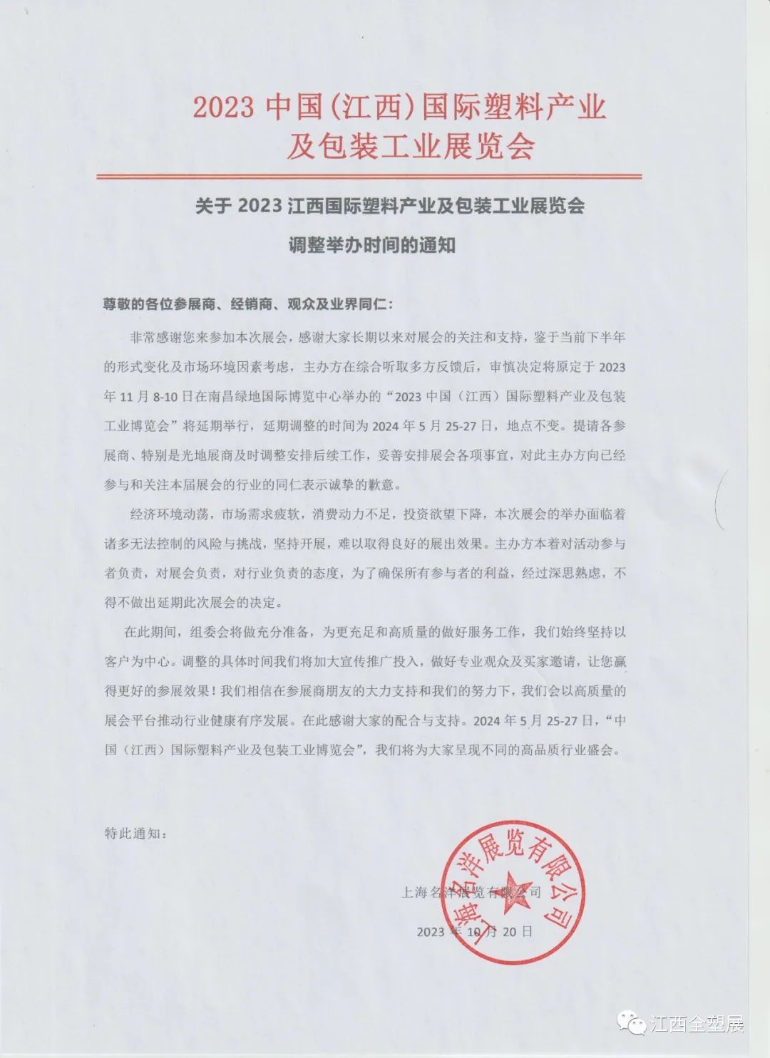 非常感谢您来参加本次展会,感谢大家长期以来对展会的关注和支持,鉴于当前下半年的形式变化及市场环境因素考虑,主办方在综合听取多方反馈后,审慎决定将原定于2023年11月8-10日在南昌绿地国际博览中心举办的“2023中国(江西)国际塑料产业及包装工业博览会”将延期举行,延期调整的时间为2024年5月25-27日,地点不变。提请各参展商、特别是光地展商及时调整安排后续工作,妥善安排展会各项事宜,对此主办方向已经参与和关注本届展会的行业的同仁表示诚挚的歉意。
