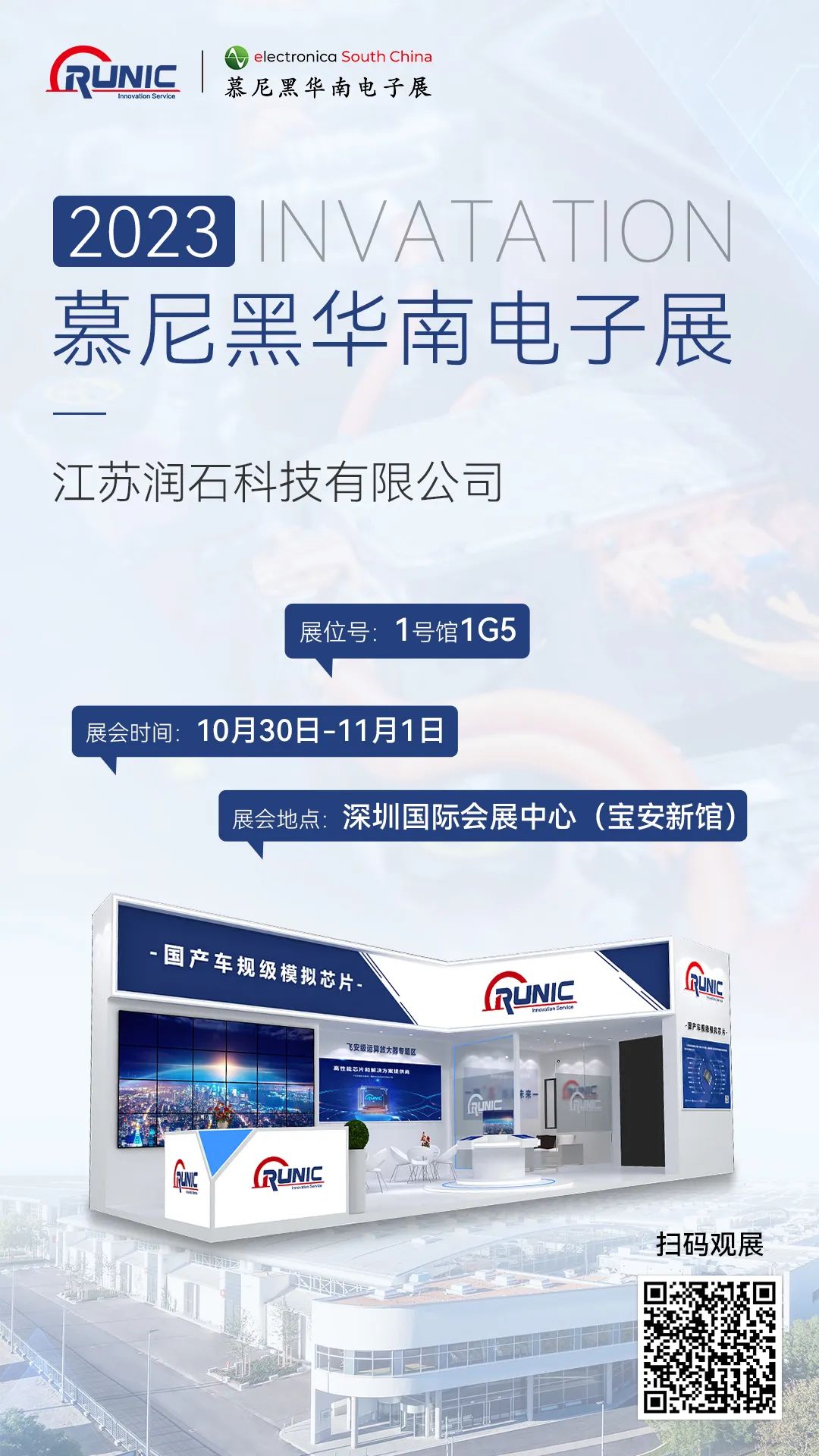 慕尼黑华南电子展将于2023年10月30日至11月1日在深圳国际会展中心(宝安新馆)举行;江苏润石诚邀模拟IC上下游行业伙伴莅临1G05号展位现场观展交流。江苏润石将通过展会介绍在信号链和电源管理领域最新推出的新品,以及在汽车电子领域车规级产品的应用介绍。通过与我们面对面交流,您将更加深入地了解我们的产品和服务,并有机会建立起长期稳定的合作关系。