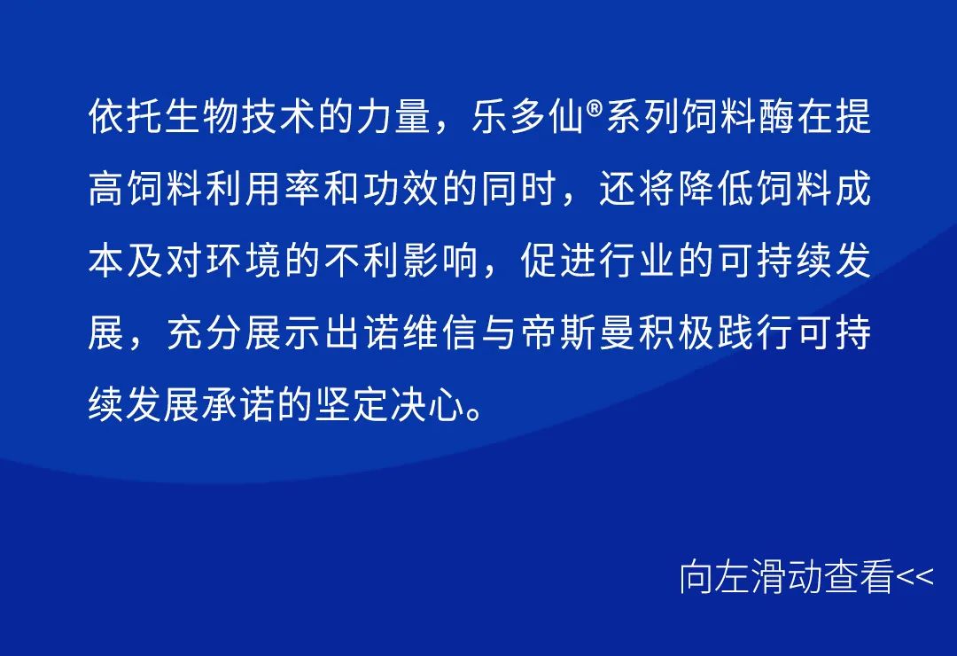 “作为生物解决方案领域的全球先导,诺维信致力于以生物之力为农业及工业创造一个更加可持续的未来。与帝斯曼联袂打造的乐多仙®系列饲料酶不仅可以帮助企业提质增效,降低养殖成本,同时还可以减少化学品的使用,有效降低碳足迹,创造经济和环保效益双丰收。未来,我们将继续和合作伙伴一道,探索自然之力,为中国带来更多可持续的产品和技术。”