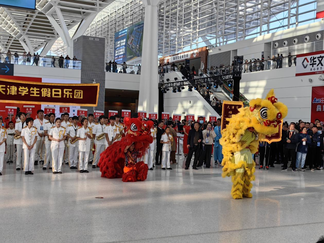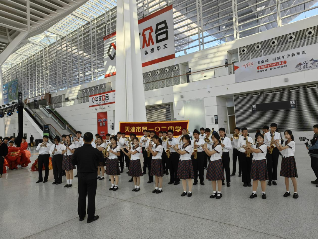 据了解,本次演绎《我和我的祖国》《歌唱祖国》《青春进行曲》等乐曲的天津学生假日乐团与第九中学、第一〇二中学的学生管乐团因成为首次登陆国家会展中心(天津)的学生乐团而载入史册。活动中,第五中学、第二十五中学、天津科技大学附属柳林小学舞狮队联袂献上《津门狮趣》《中华雄狮》,滨海新区塘沽盐场中学大沽龙灯队的《吉祥天地》精彩亮相,展示了天津市学校美育实践课堂的丰硕成果。