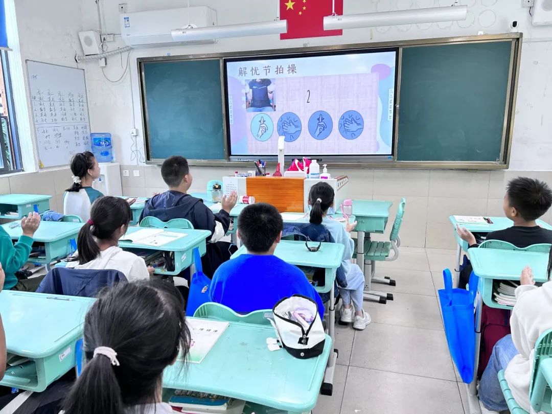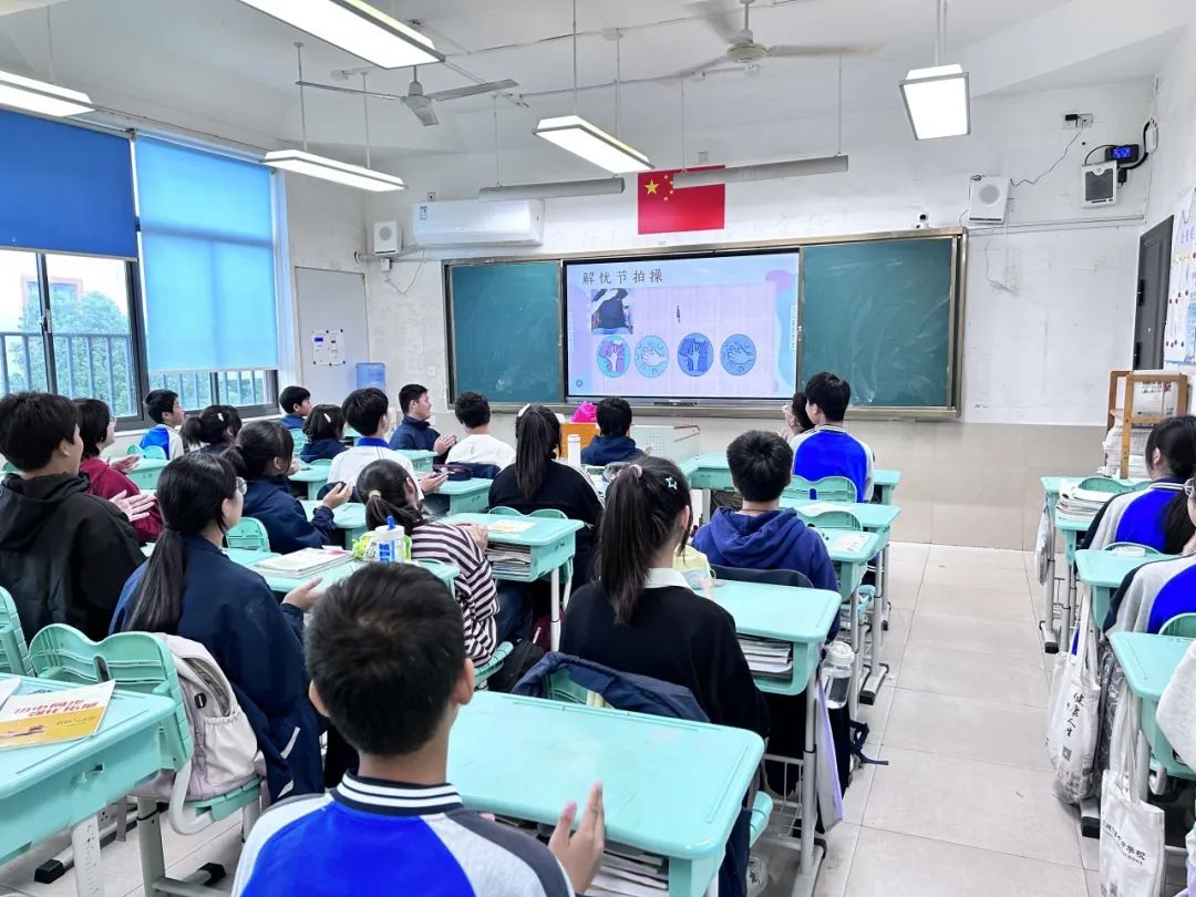 同学们在音乐节奏的引领下,做起了节拍操,暂时忘记忧虑与烦恼。