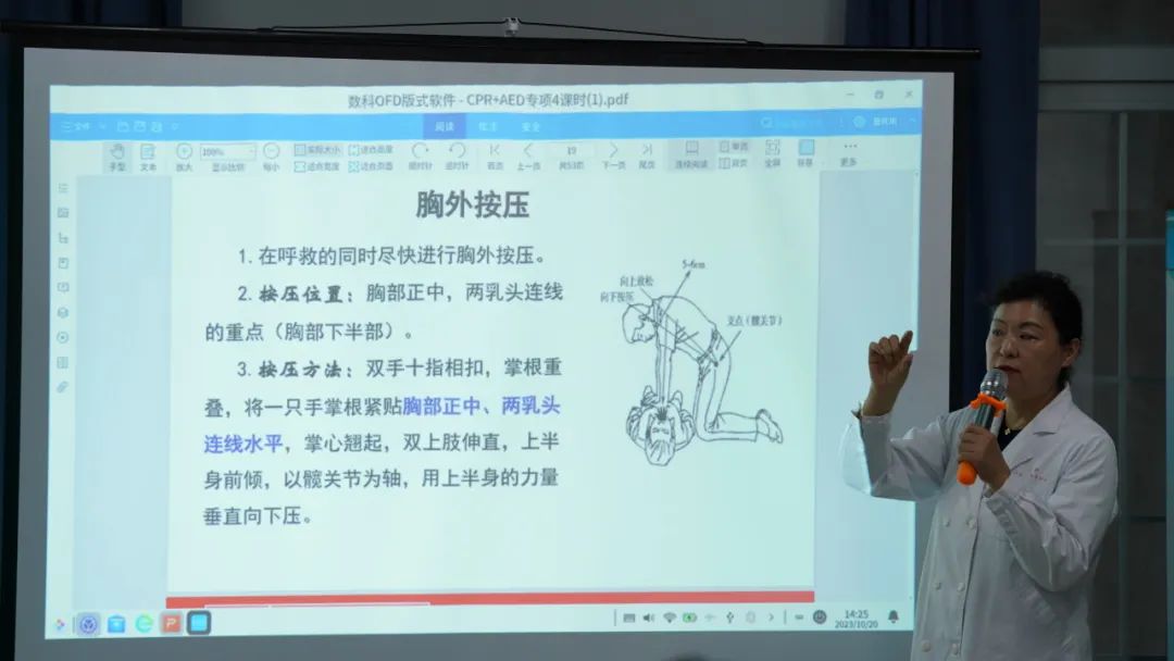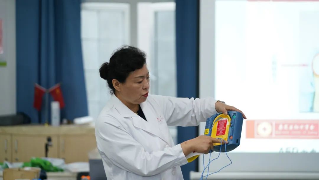 现场,来自真新社区卫生服务预防保健科的周冬梅为志愿者们开展了一场干货满满的应急救护知识主题培训。通过理论讲座,视频演示和示范操作,志愿者们深入了解关于心肺复苏、气道异物梗阻等常见意外的相关应急救护知识。同时,周医生向大家展示了AED自动体外除颤器,简单讲解其使用方法及注意事项。