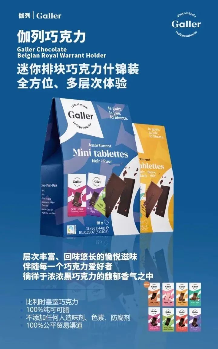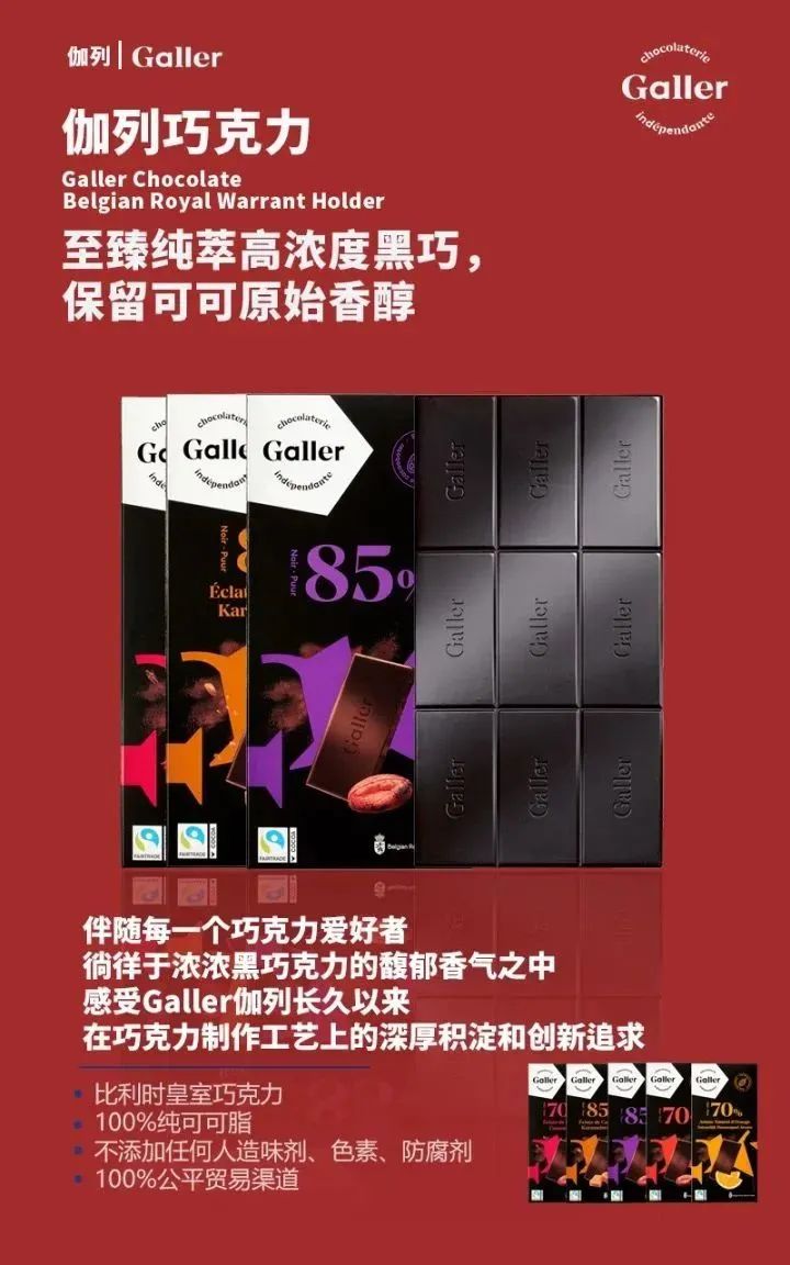伽列巧克力工厂于1976年创建于比利时列日,是一家由170位巧克力爱好者经营的工厂。一直以来,伽列以满足比利时普通市民、皇家成员在内的全世界人民对优质巧克力的需求为目标,是比利时皇家御用指定巧克力品牌。伽列只使用来自公平贸易渠道的原材料来生产优质的巧克力,产品不含棕榈油,使用100%可可脂、100%公平贸易认证可可豆,不添加任何人造味剂、色素、防腐剂。自2016年起,伽列荣获英国零售商协会(BRC FOOD)国际食品质量认证。