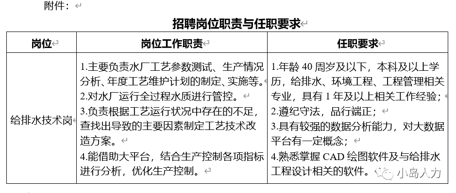 给排水技术岗,1名。