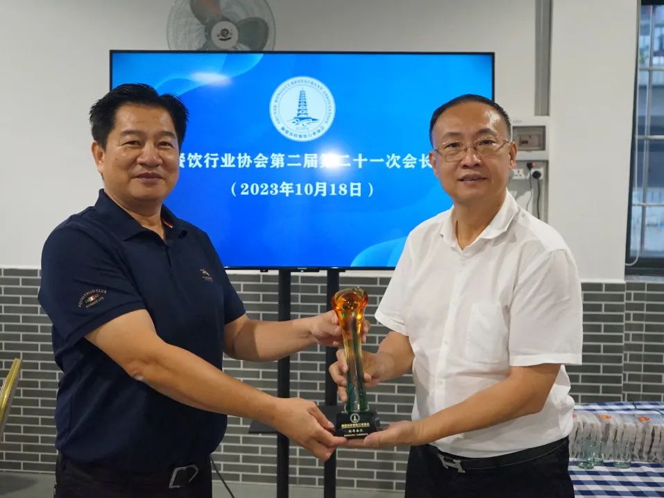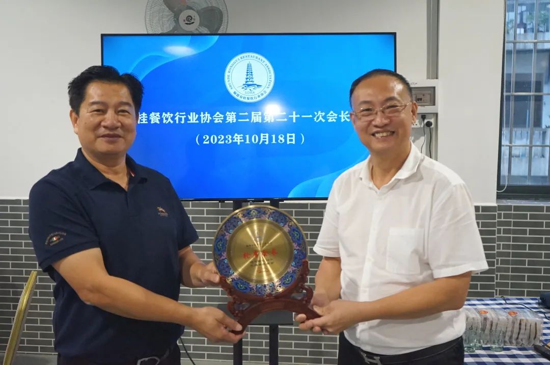 容桂餐饮行业协会会长罗兆波传递火炬、轮值会长纪念牌给10月轮值会长、容桂餐饮行业协会副会长黄治强。