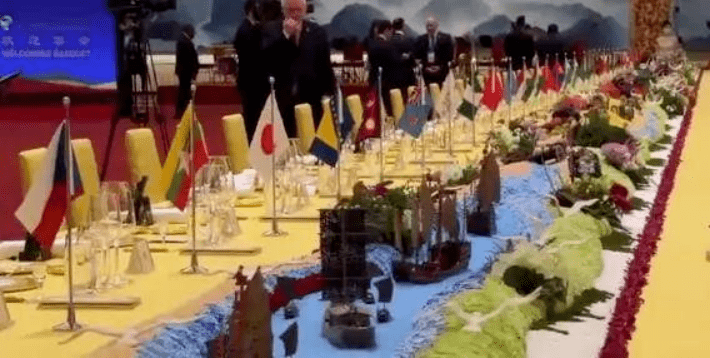 10月17日晚,国际贵宾齐聚北京,来华出席第三届“一带一路”国际合作高峰论坛。这次晚宴的规模和布置可谓是令人瞩目,40多米长的金色大厅餐桌上,摆满了各种精美的菜肴,让人垂涎欲滴。