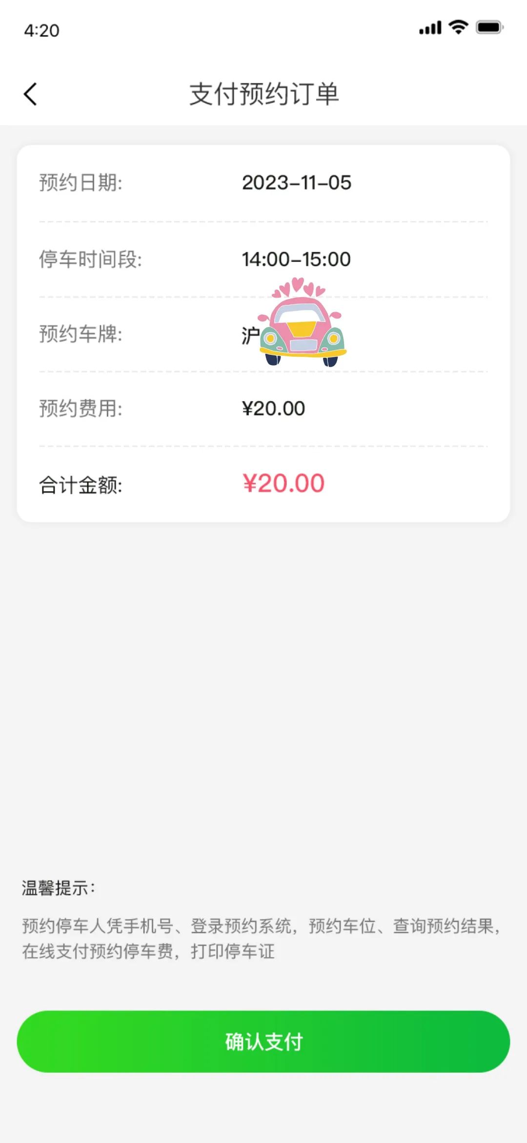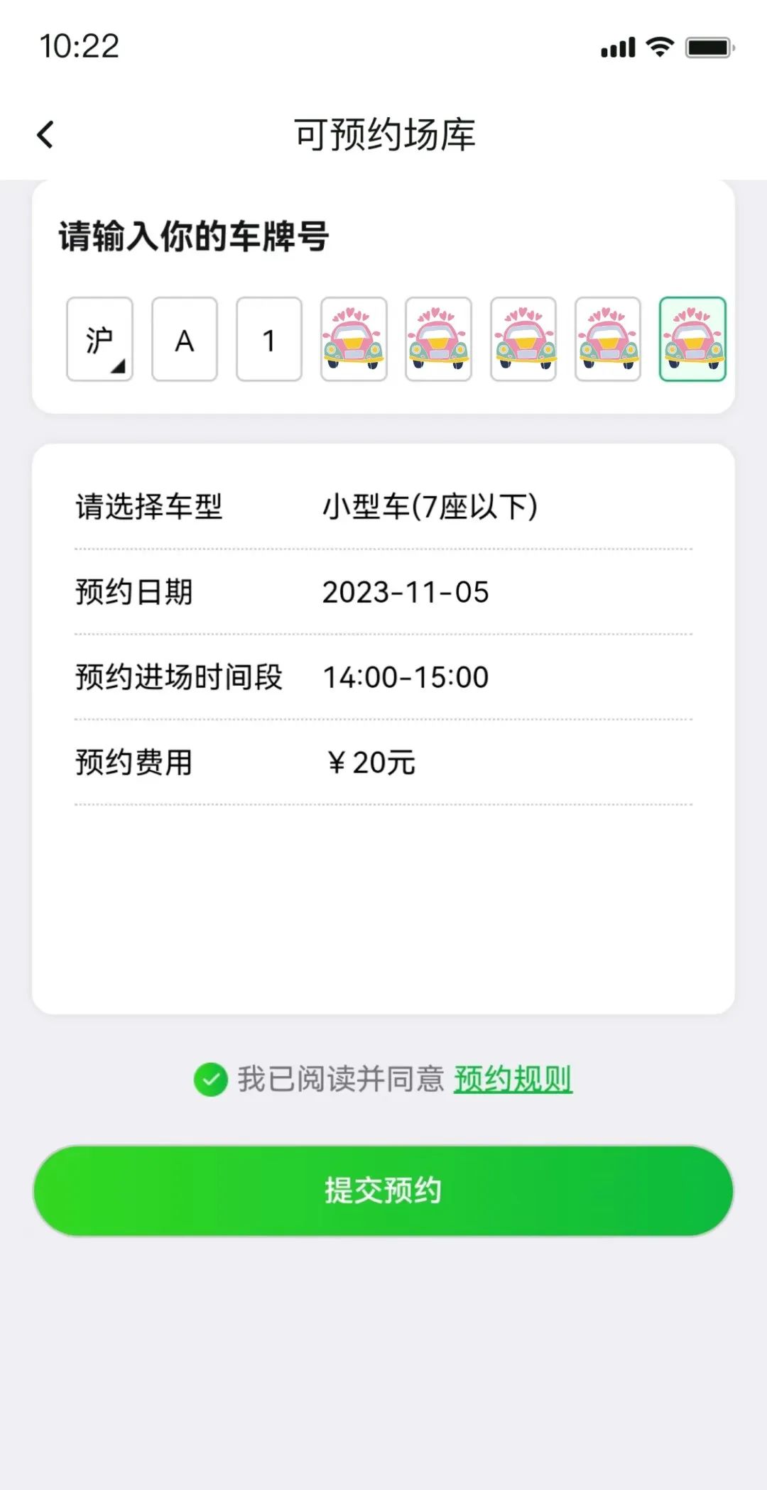 输入车牌号,选择车型,预约进场时间段。阅读停车预约须知,点击“我同意”后提交预约↓