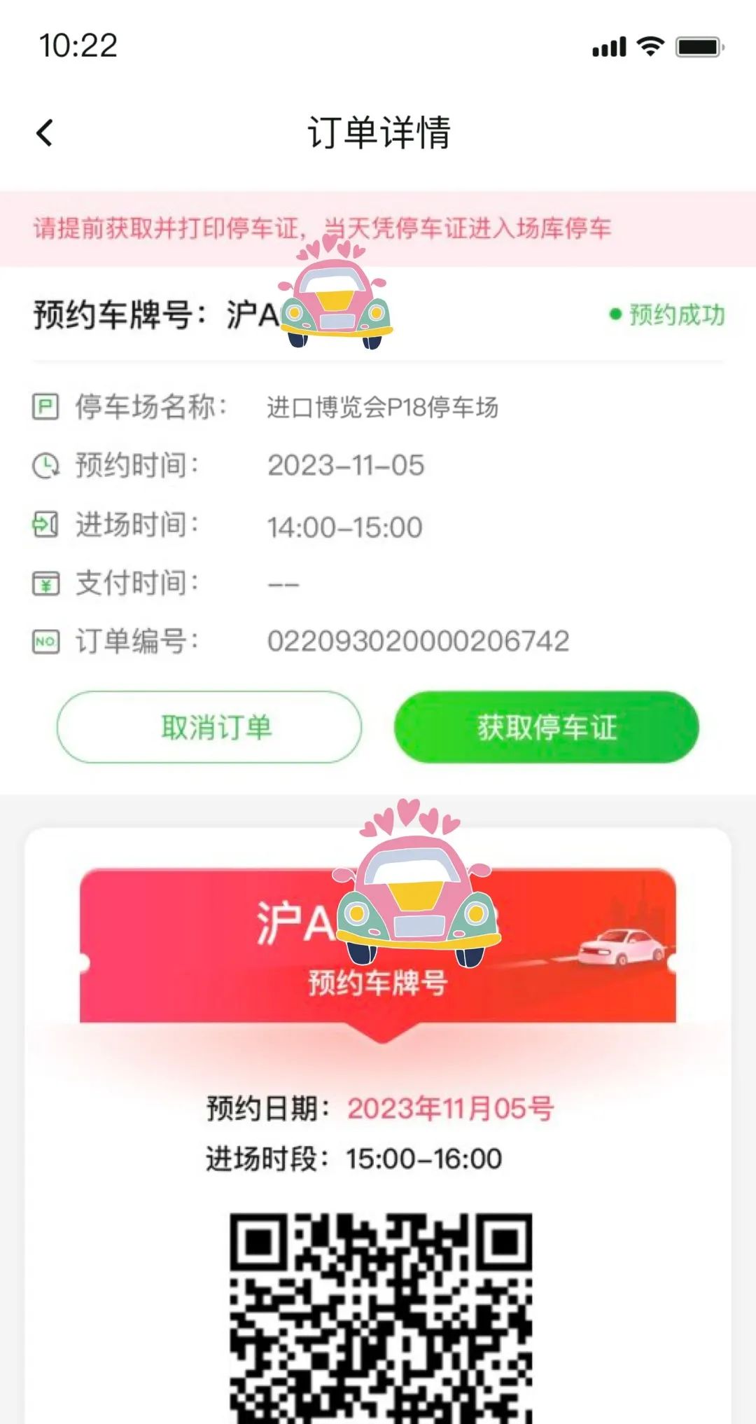 11月1日起可以获取停车证,下载打印,在您预约的时间段内,您可以凭停车证入场停车↓