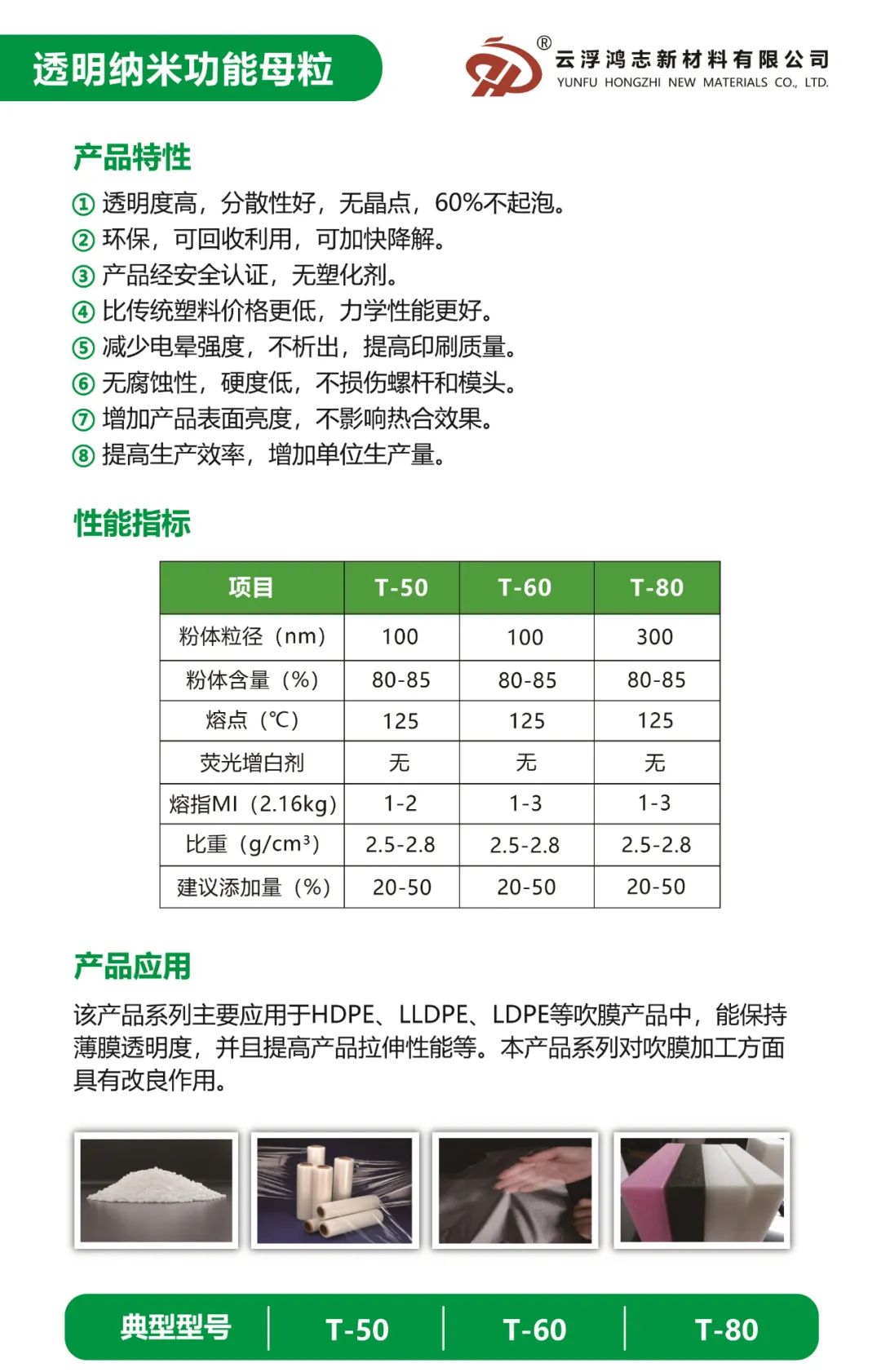 公司产品主要应用于改性塑料(如高光PP、ABS、PE、PS、PA、PPO、PPS、PBT、PET、阻燃塑料、汽车塑料、家电外壳、建材塑料等);功能薄膜(如购物袋、垃圾袋、连卷袋、缠绕膜、流延膜、保护膜、收缩膜、地膜、光学膜、锂电池隔膜等);色母粒(如彩色母粒、黑色母粒、白色母粒);生物降解塑料(如一次性餐具、购物袋、农用薄膜、3d打印材料)等行业作为功能填料。