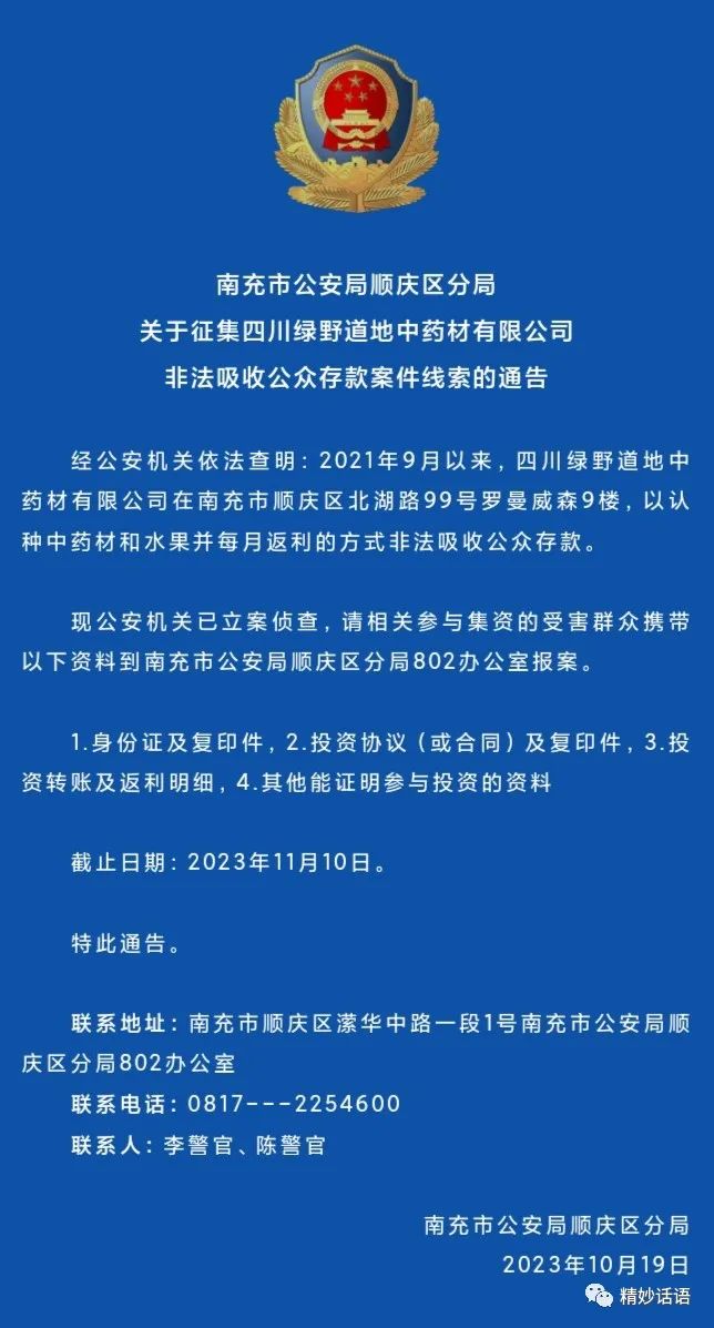 2023年10月19日,南充市公安局顺庆区分局对外发布了关于征集四川绿野道地中药材有限公司非法吸收公众存款案件线索的通告。具体如下: