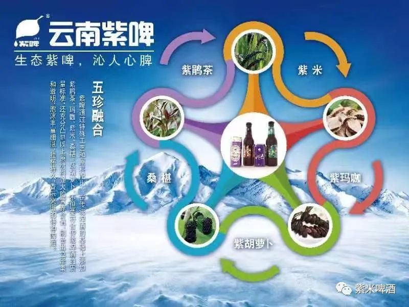 紫啤啤酒依托云南得天独厚的紫玛咖、紫米、紫薯、紫鹃茶等植物资源,充分利用啤酒庞大的消费载体,着手开发“紫啤”产品系列。公司就玛咖紫米啤酒的原料配伍、配伍比例、口感、保健效果、工艺等方面进行研究,期间对比国内外数十种啤酒,经过上百次的试验,于2015年6月将一款独特的植物生态啤酒——“紫啤”,推向了市场。
