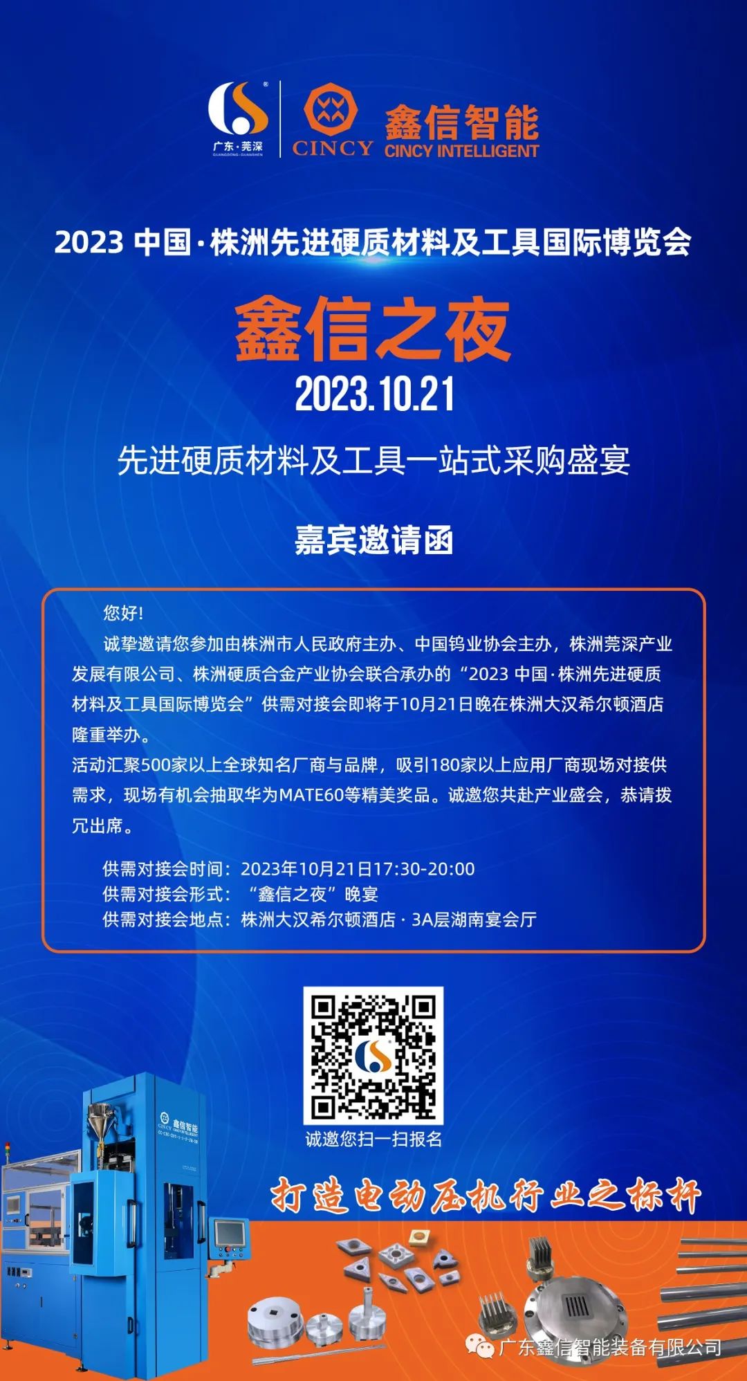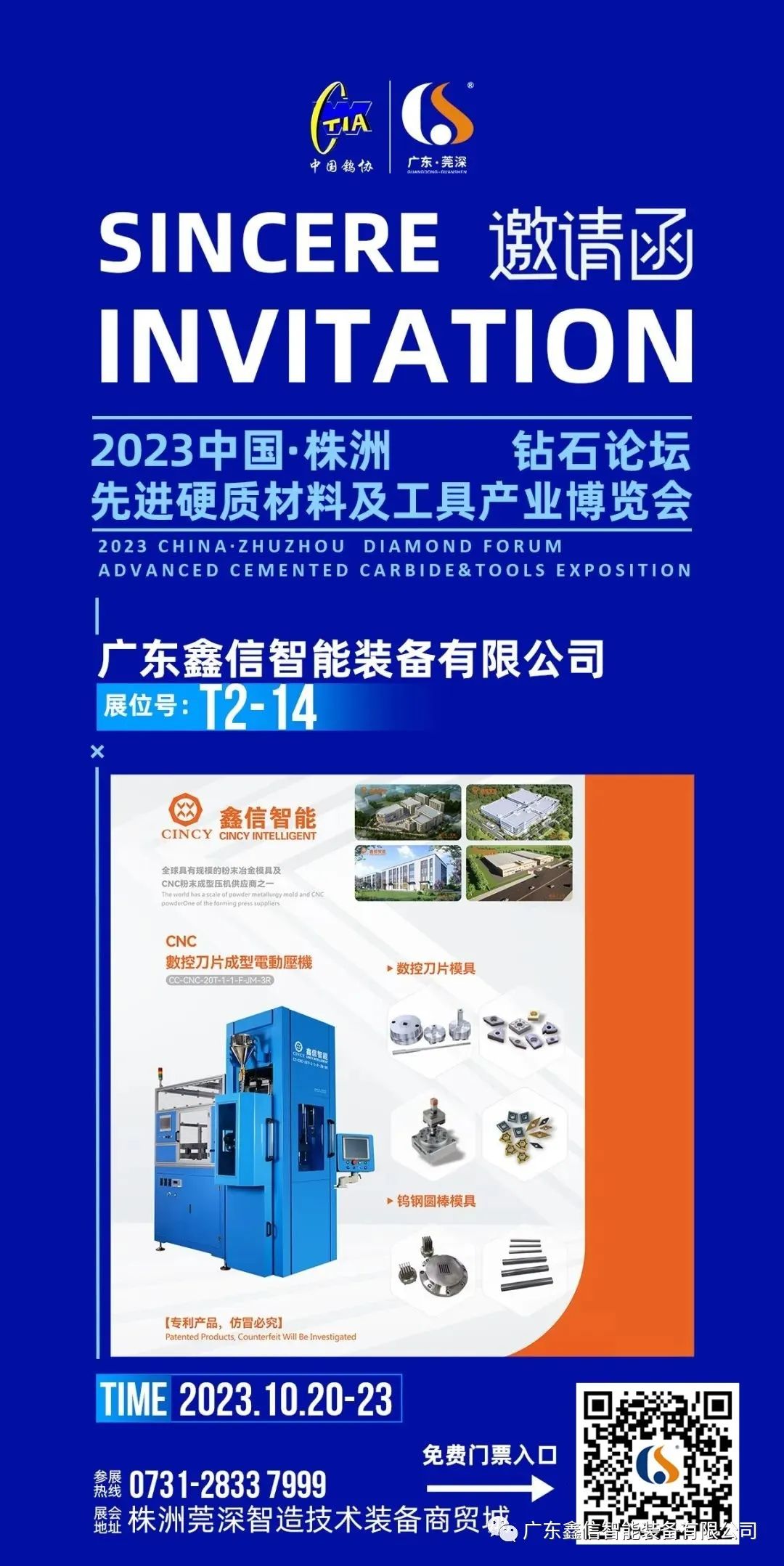 2023株洲先进硬质材料及工具博览会将于10月20日在株洲莞深制造商贸城举行,广东鑫信智能装备有限公司诚邀您莅临我司展位T2-14观展,我们将为您展示一系列硬质合合金模具、刀片模具、数控成型电动压机等产品,产品广泛应用于粉末冶金、磁性材料、电感一体成型、精密陶瓷、5G滤波器、药业、碳刷、硬质合金、数控刀片、刀具、冷鐓、紧固件、注射成型、冲压成型、新能源、锂电池、汽车零部件、3C等行业。欢迎您到场参观交流,届时我司业务/技术人员将在现场进行答疑互动及技术交流。