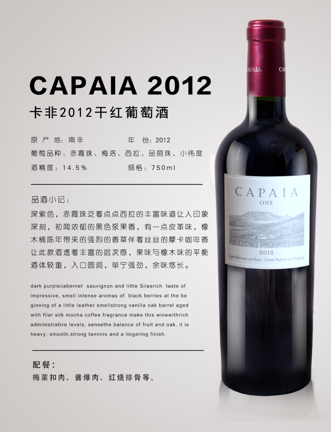 南非酒有点像法国波尔多葡萄酒(以单调乏味和稀薄微妙为特点)和加州或澳大利亚葡萄酒(以平易近人和成熟的果肉为特点)的混合体。在优质的南非赤霞珠既有法国酒的宁静,又有加州式的诱人果香。它们单宁厚重、有陈年潜力,酒体醇厚有劲道,果香中除了黑色水果的宜人,通常还有薄荷的味道。这样的酒搭配酱汁浓郁的牛排、烤牛肉都非常棒,它焦糖的甜味以及能化解油腻的酒精味都是搭配北京烤鸭的上上选。中餐的里很难找到被南非赤霞珠更为百搭的葡萄酒。